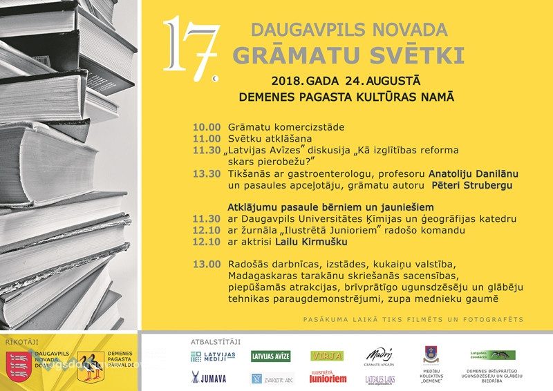 Piektdien, 24. augustā, Demenes pagasta kultūras namā (Briģenes ielā 2, Demenē) notiks Daugavpils novada 17. Grāmatu svētki, kas piedāvā plašu programmu gan pieaugušajiem, gan jauniešiem un bērniem. Programma (PDF)