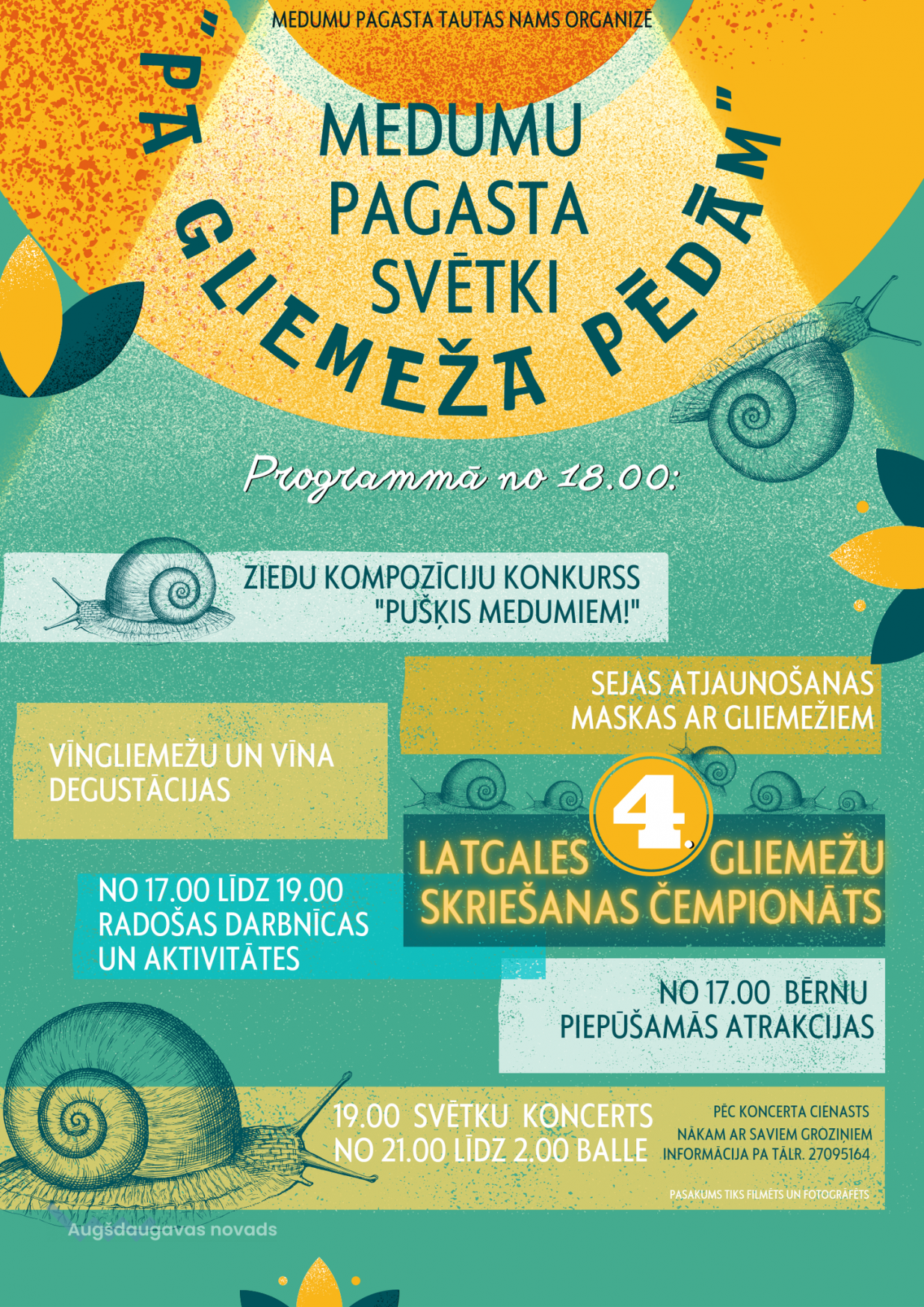 Noslēgsim šo vasaru ar jautru un siltu noskaņu! 19. augustā no plkst. 17.00 visi laipni aicināti uz Medumu pagasta svētkiem (pie Medumu Tautas nama, Alejas ielā 2)! Šogad programma būs īpaši interesanta, jo tā saistīta ar gliemežiem. Šajā dienā gliemežus būs iespējams gan pagaršot, gan izveidot un izkrāsot radošās darbnīcās, gan ar to palīdzību izbaudīt sejas maskas, kā arī uzmundrināt savu gliemezi Latgales 4. skriešanas čempionātā (18.00)! Bērniem būs iespēja izklaidēties piepūšamajās atrakcijās un piedalīties sporta aktivitātēs. Svētku laikā notiks ziedu kompozīciju konkurss “Pušķis Medumiem”.