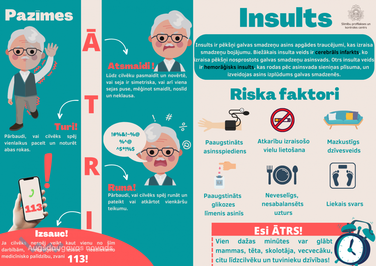 Šogad Pasaules insulta dienas ietvaros SPKC speciālisti ir izstrādājuši infografiku “Insults” un darba lapu skolēniem par insulta riska faktoru atpazīšanu. Pielikumā nosūtam infografiku PDF un PNG formātā un darba lapu PDF formātā, tematiskās dienas tēmas aktualizēšanai pašvaldībā.