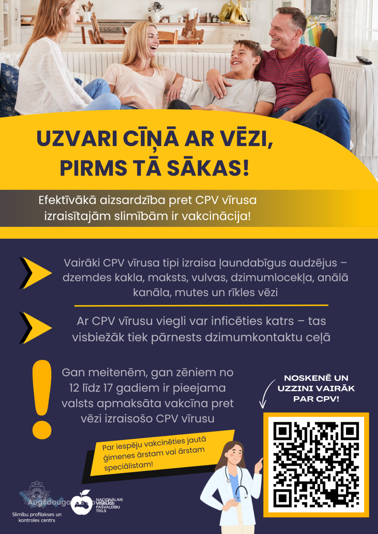 Šogad SPKC speciālisti ir sagatavojuši plakātu “Uzvari cīņā ar vēzi, pirms tā sākas” .png un .pdf formātā (A4 un A3 izmēros), lai atgādinātu iedzīvotājiem par CPV infekciju, iespējamajām saslimšanām un profilakses pasākumiem. Aicinām plakātu izplatīt pašvaldības mājaslapā un/vai sociālo tīklu kontos, kā arī nodot informāciju par CPV izglītības iestādēm un ārstniecības personām.