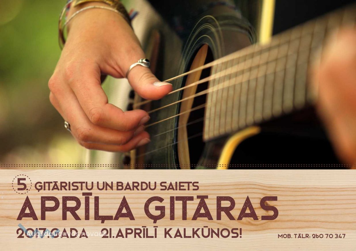 5. ģitāristu un bardu saiets “Aprīļa ģitāras”13.04.2017AKTUĀLI 21.aprīlī. plkst. 18:00 aicinām uz 5.ģitāristu un bardu saietu Kalkūnos! Jūs sagaida neaizmirstams ģitārmūzikas koncerts ar jauno mūziķu un vecmeistaru piedalīšanos. Tikšanās vieta - Aktu zāle, 2.stāvs, Ķieģeļu ielā 4, Kalkūni.