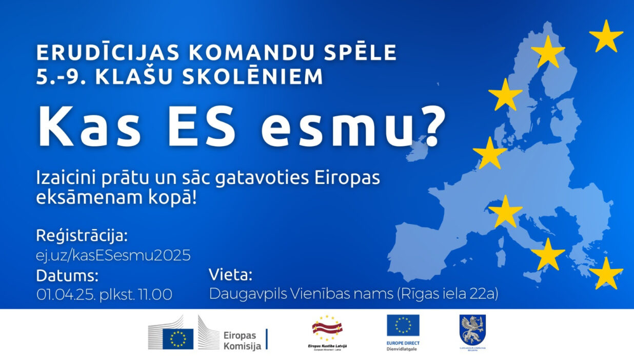Eiropas Komisijas pārstāvniecība Latvijā sadarbībā ar biedrību “Eiropas Kustība Latvijā” un EUROPE DIRECT Dienvidlatgale centrs 2025. gada 1. aprīlī Daugavpils Vienības namā (Rīgas ielā 22a) aicina pulcēties 5. – 9. klašu skolēnus, lai piedalītos izzinošā erudīcijas komandu spēlē “Kas ES esmu?”. Dalībnieku skaits komandā: 3-5.