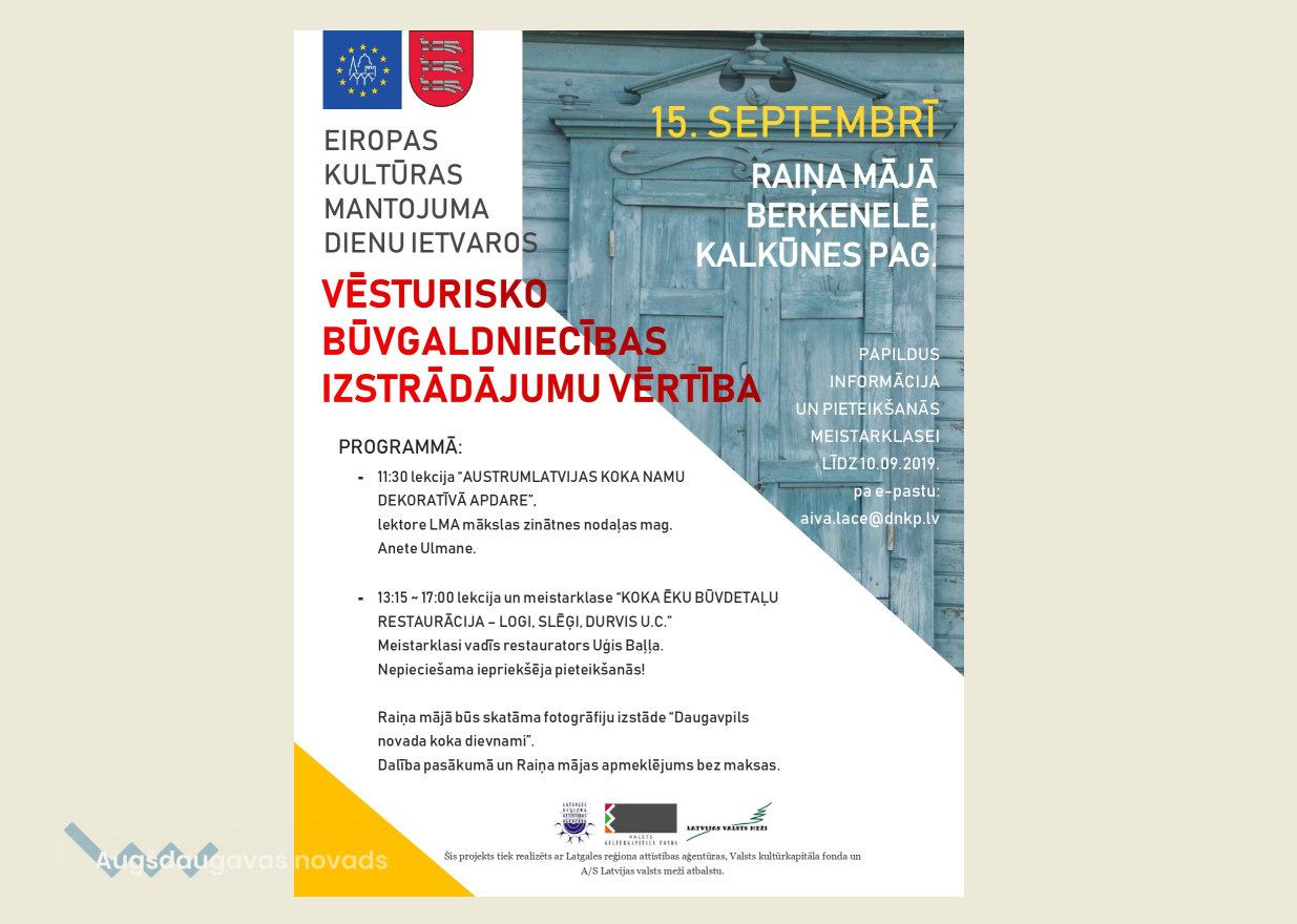 Apmeklētāji tiek aicināti 15.septembrī no plkst. 11:30 uz Raiņa māju Berķenelē, kur notiks gan teorētiskas, gan praktiskas bezmaksas nodarbības, veltītas vēsturiskajiem būvgaldniecības izstrādājumiem, to vērtības apzināšanai un praktiskajām saglabāšanas iespējām.