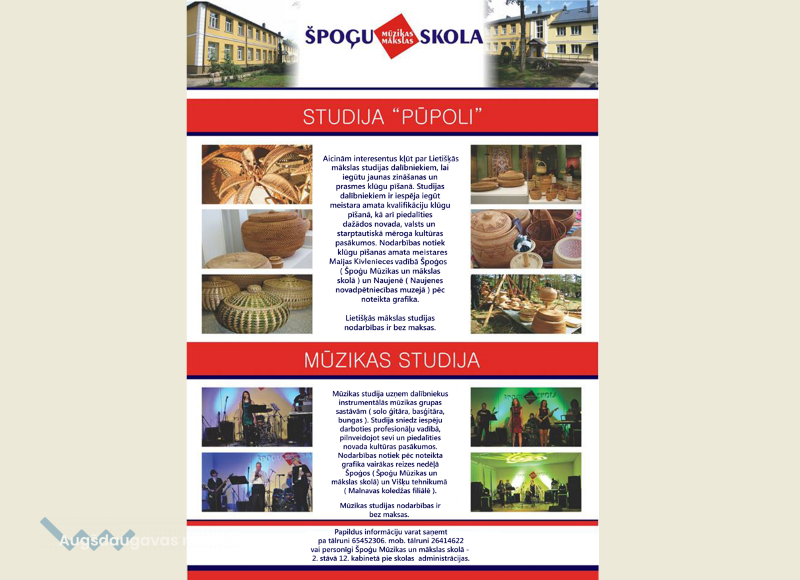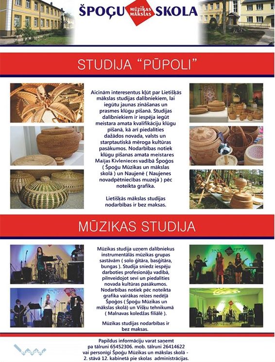 Papildus informāciju var saņemt: pa tālruni 654 52306, mob.tālruni 26414622 vai personīgi Špoģu Mūzikas un mākslas skolā - 2. stāvā, 12. kabinetā pie skolas administrācijas.