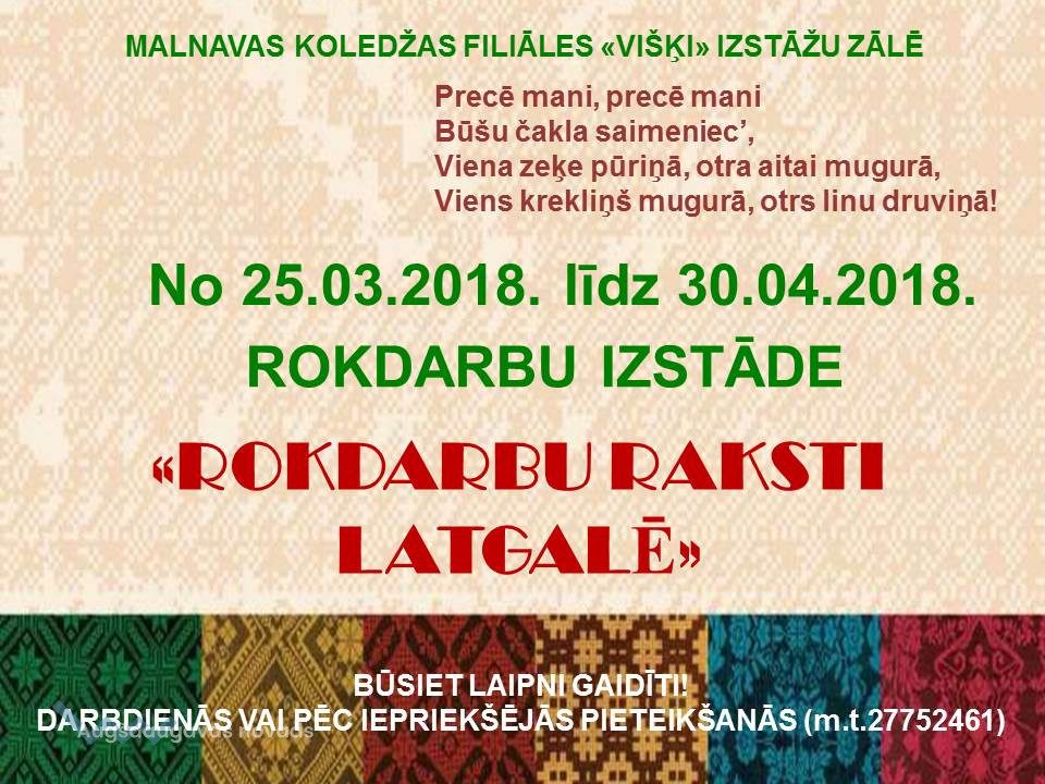 Malnavas koledžas filiāles "Višķi" izstāžu zālē no 25. marta līdz 30.aprīlim visi aicināti apmeklēt rokdarbu izstādi "Rokdarbu raksti Latgalē". Izstādē ir apskatāmi Višķu mācību iestādes absolventu un Višķu pagasta rokdarbnieču rokdarbi. Izstādi ir iespēja apmeklēt darbdienās vai iepriekš piesakoties pa t.27752461
