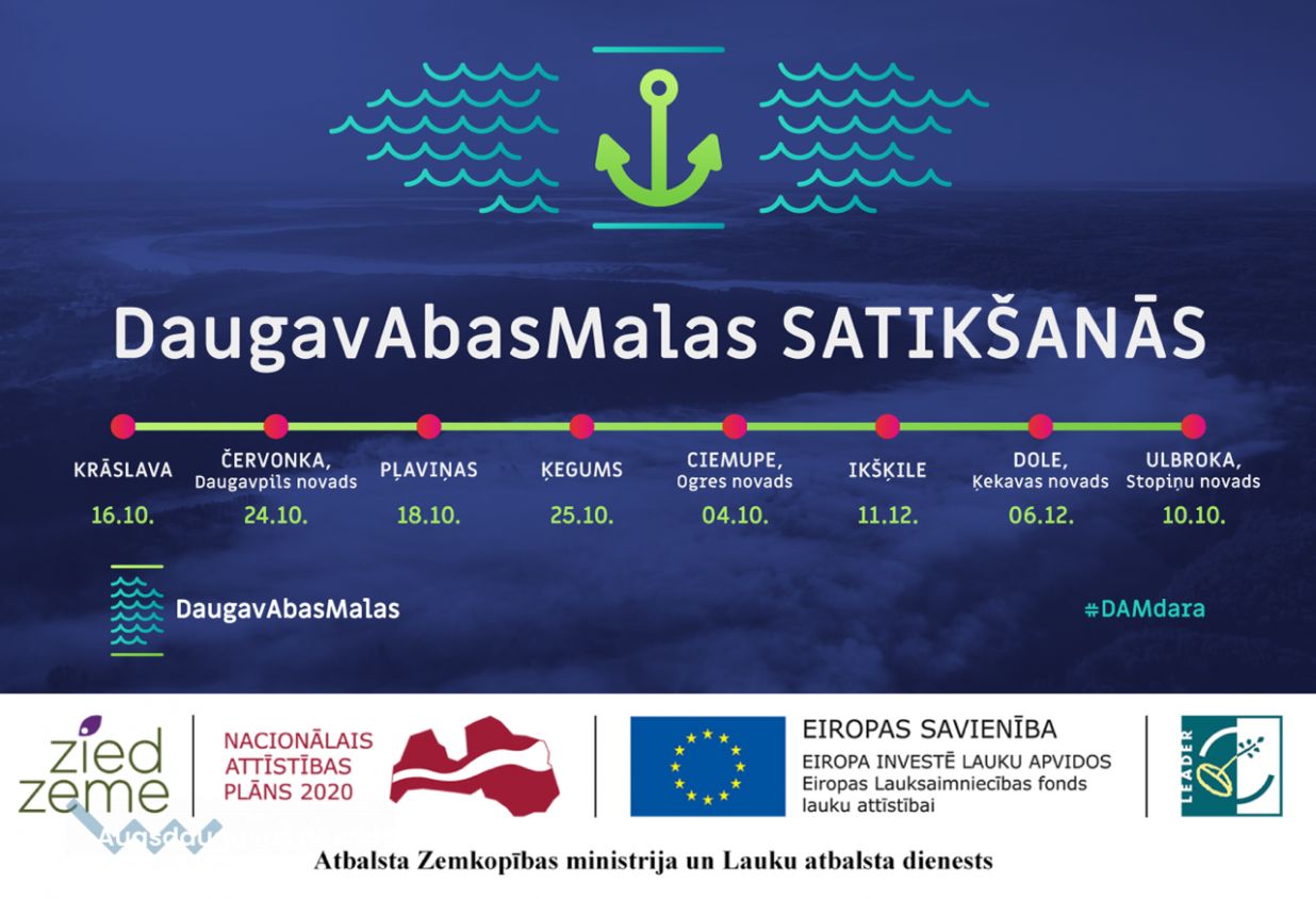 Sadarbības projektu “DaugavAbasMalas” īsteno Publisko un privāto partnerattiecību biedrība “Zied zeme” (www.ziedzeme.lv) sadarbībā ar 21 pašvaldību, 7 vietējās rīcības grupām un citiem stratēģiskajiem partneriem. Projektu atbalsta Zemkopības ministrija un Lauku atbalsta dienests, finansē - Eiropas Lauksaimniecības Fonds lauku attīstībai.