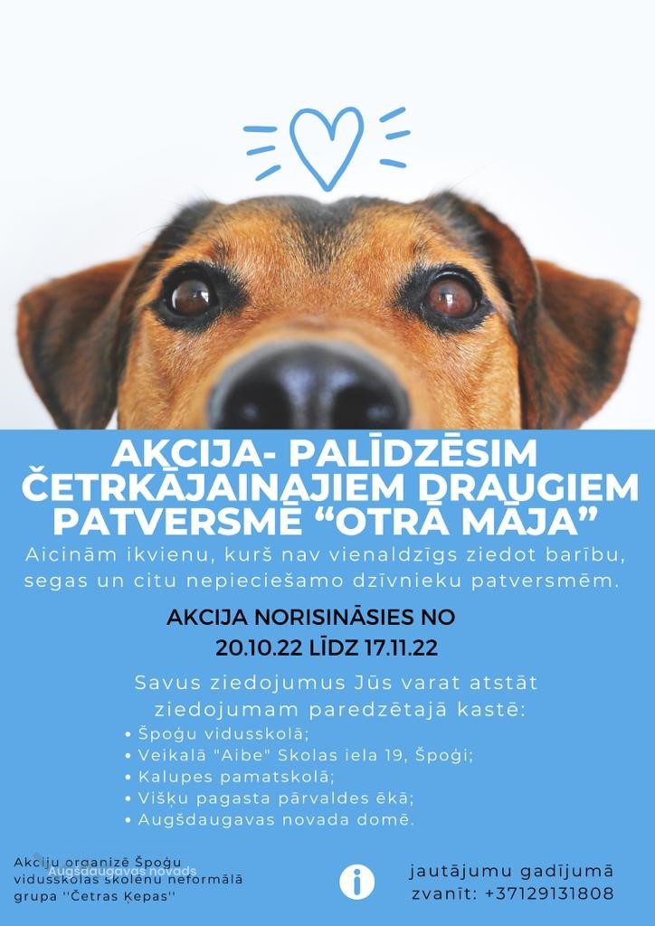 Mēs esam Špoģu vidusskolas 12. a klases skolnieces, kuras mācību projekta ietvaros nolēma izveidot neformālo grupu „Četras ķepas”. Šī projekta ietvaros mēs nolēmām veidot akciju, kuras mērķis ir palīdzēt patversmēs nonākušajiem dzīvniekiem. Mēs izvēlējāmies palīdzēt Augšdaugavas novada patversmei „Otrās mājas”.