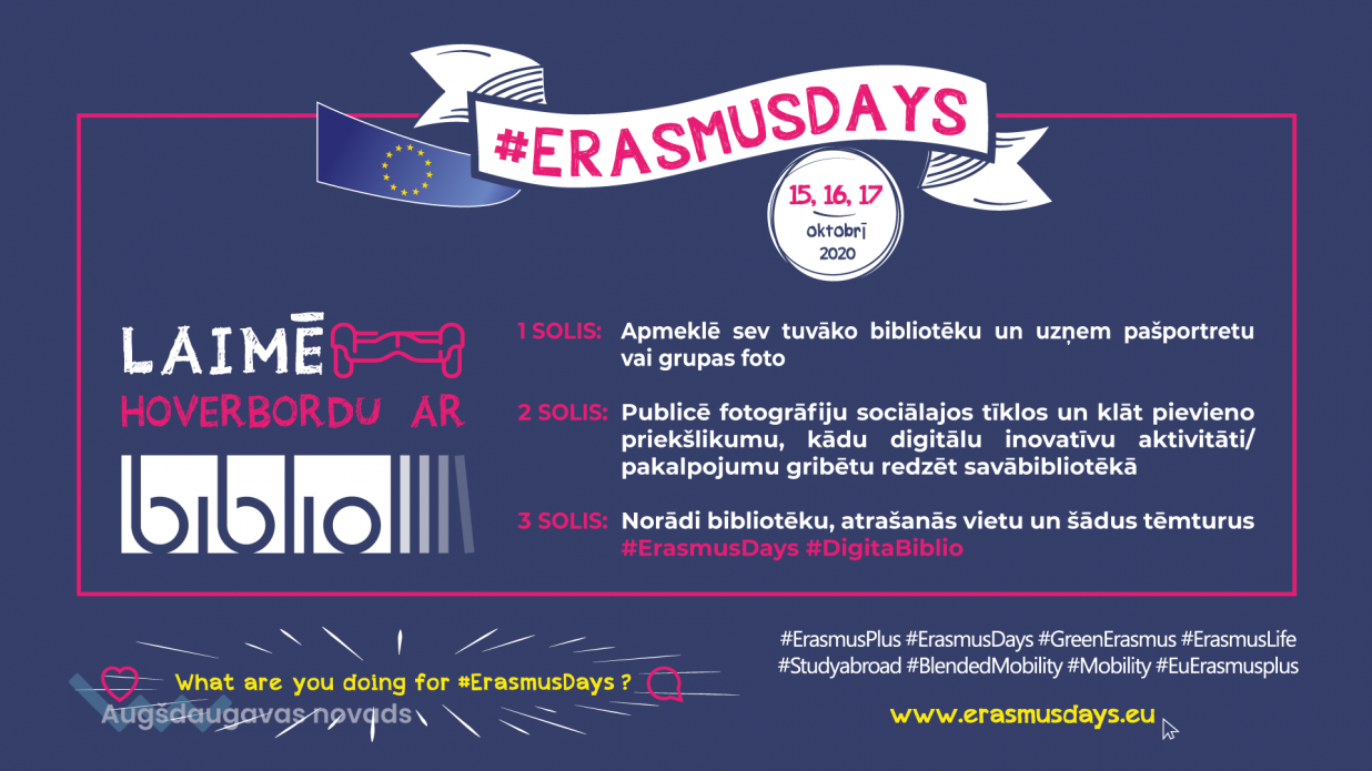 Ikviens ir aicināts pievienoties BIBLIO projektam, lai kopā nosvinētu Erasmus+ programmas #ErasmusDienas. Šajās trīs dienās Erasmus+ projektu īstenotāji un profesionāļi no visiem izglītības sektoriem organizē dažādus pasākumus, komunicējot par vērtībām, ieguvumiem no mobilitātes un popularizē Erasmus+ projektu rezultātus.