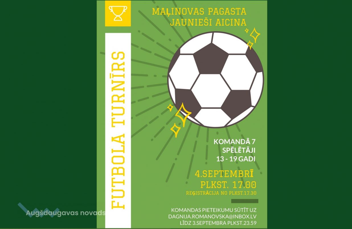 Maļinovas pagasta jaunieši aicina uz futbola turnīru, kas norisināsies 4. septembrī plkst. 17.00 Maļinovas ciema futbola laukumā pie jauniešu centra. Spēles ilgums ir 2x15 minūtes. Pārtraukums – 5 minūtes. Aicinām pieteikt jauniešu komandas 7 cilvēku sastāvā vecumā no 13 gadiem.