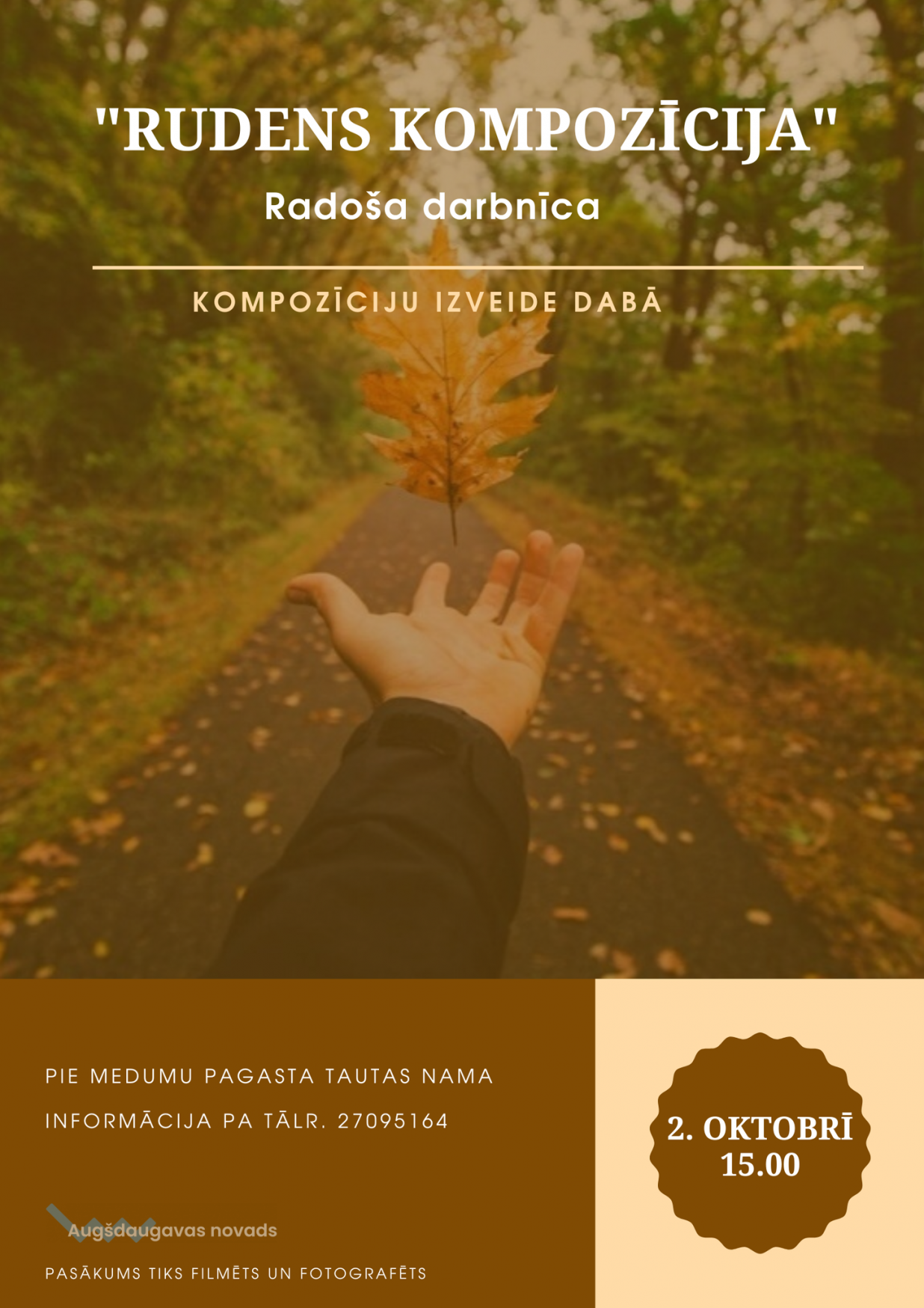 Aicina uz rudens kompozīciju veidošanu Medumos26.09.2022AKTUĀLI 2. oktobrī plkst. 15.00 pie Medumu tautas nama radoši pastrādāsim ar dabas materiāliem. Izveidosim patriotiskas rudens kompozīcijas un iemūžināsim sevi fotogrāfijās. Gaidām visu vecumu iedzīvotājus! Ienirsim krāšņajā rudenī!