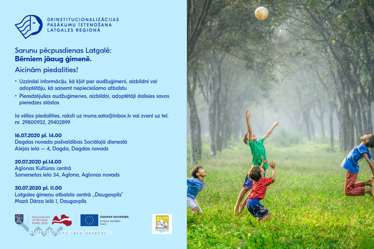 2020. gada 30. jūlijā plkst. 11:00 Latgales ģimeņu atbalsta centra ,,Daugavpils” telpās, Mazā Dārza ielā 1, Daugavpilī gaidīsim potenciālos aizbildņus, adoptētājus un audžuģimenes, kā arī citus interesentus uz sarunu pēcpusdienu “Bērniem jāaug ģimenē”.