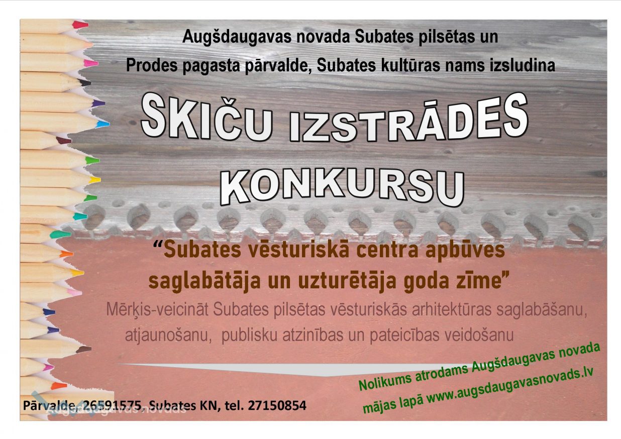 Aicinājums piedalīties skiču konkursā14.03.2022AKTUĀLI Augšdaugavas novada Subates pilsētas un Prodes pagasta pārvalde, Subates kultūras nams izsludina skiču izstrādes konkursu “Subates vēsturiskā centra apbūves saglabātāja un uzturētāja goda zīme”. Nolikums