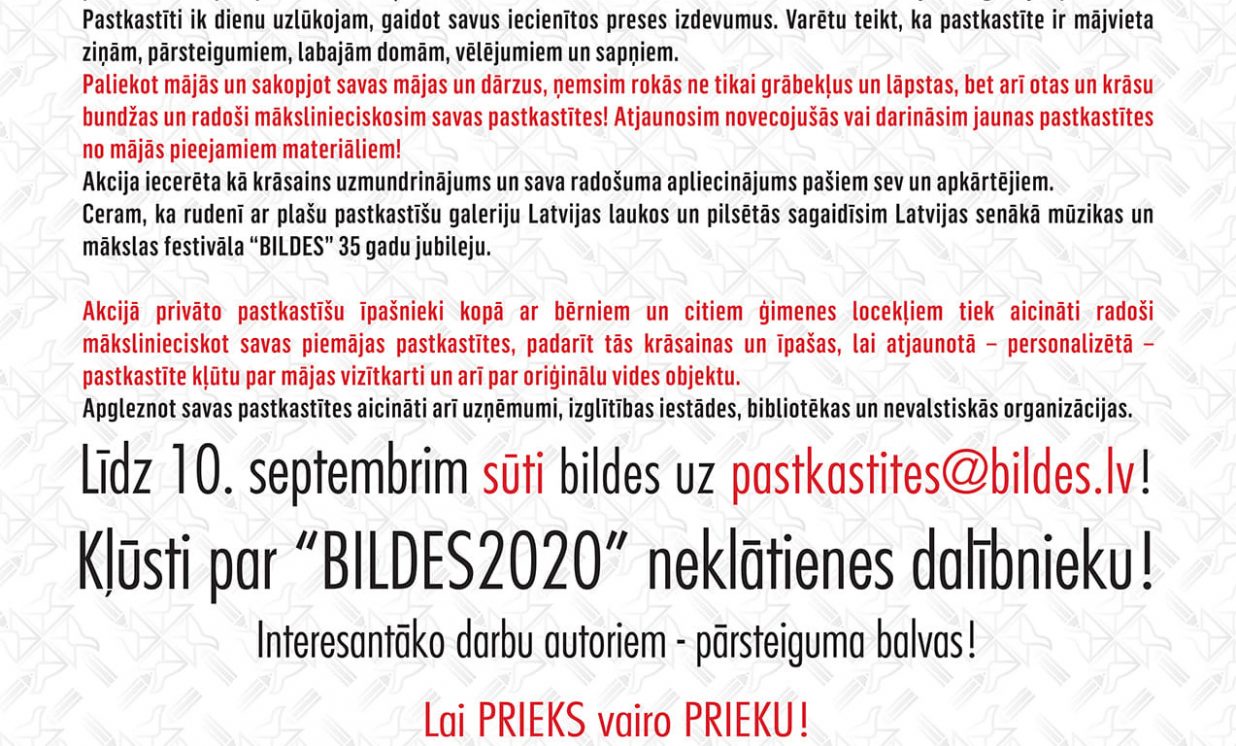 Šajā visiem tik sarežģītajā, trauksmes un pārdomu pilnajā laikā “BILŽU BIROJS” aicina saglabāt možu garu, nedaudz "izkrāsot" savu ikdienu, piedaloties akcijā “ApGLEZNO un noBILDĒ arī Tu savu pastkastīti!” un kļūstot par mūzikas un mākslas festivāla “BILDES 2020” neklātienes dalībnieku.