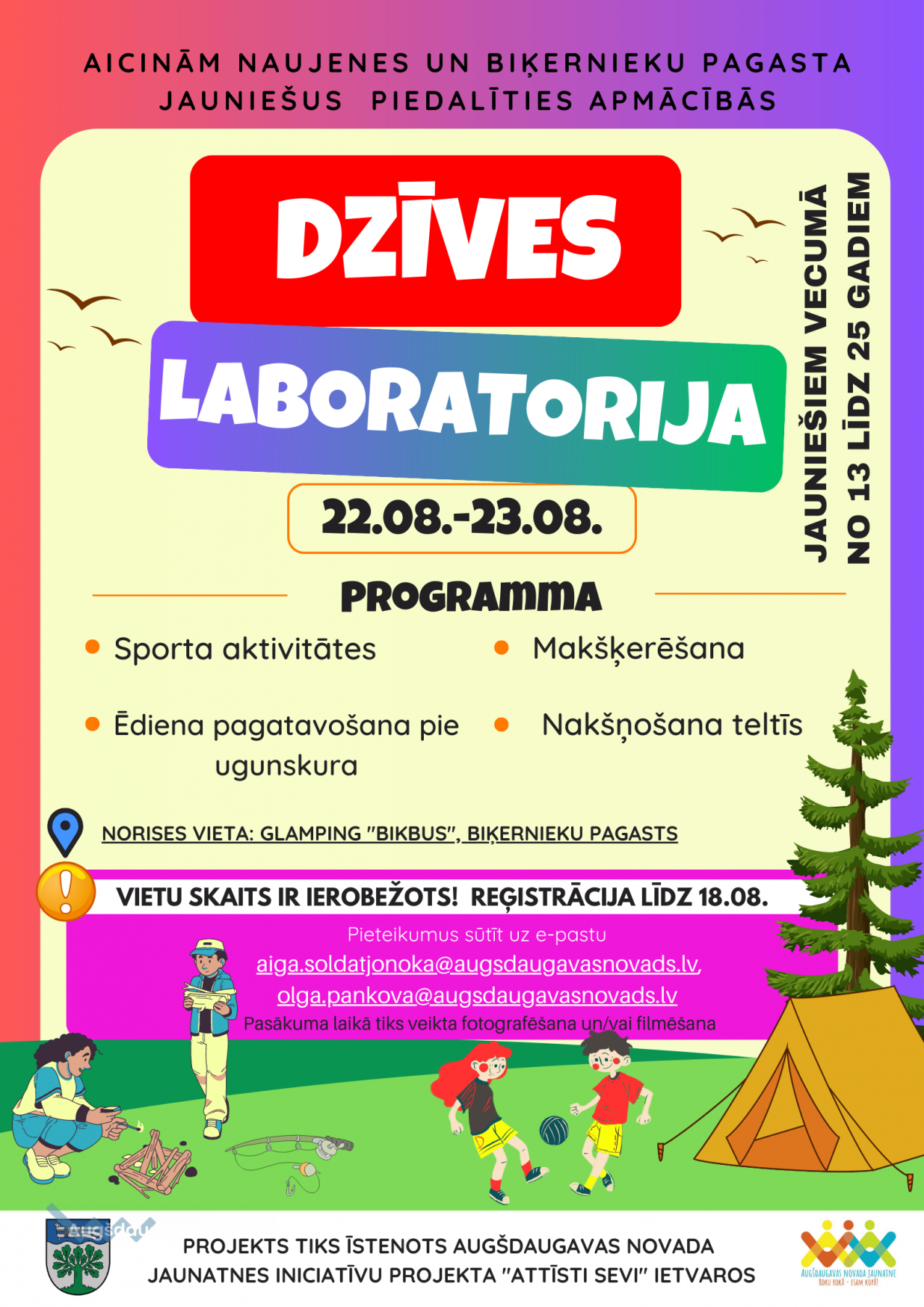 Aicinām Naujenes un Biķernieku pagasta jauniešus vecumā no 13 līdz 25 gadiem piedalīties apmācībām “Dzīves laboratorija”, kas notiks 22.08.2023-23.08.2023. Norises vieta : Glampings “BIKBUS”, Biķernieku pagasts.