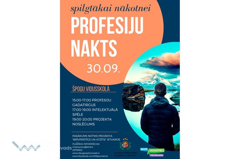 Jaunieši un citi interesenti aicināti piedalīties profesiju naktī, kas norisināsies 30.septembrī no plkst. 15:00 Špoģu vidusskolā. Jauniešiem būs iespēja iegūt informāciju par dažādām profesijām, organizācijām, uzņēmumiem, profesionālās izglītības iestādēm un to iespējam, kā arī praktiski padarboties. Pēc Profesiju gadatirgus norisināsies arī intelektuālā spēle, kas tiks pieskaņota brīvprātīgā darba tēmai un dažādām profesijām. Pasākuma noslēgumā arī apkoposim projekta “Brīvprātīgs un atzīts!" rezultātus.