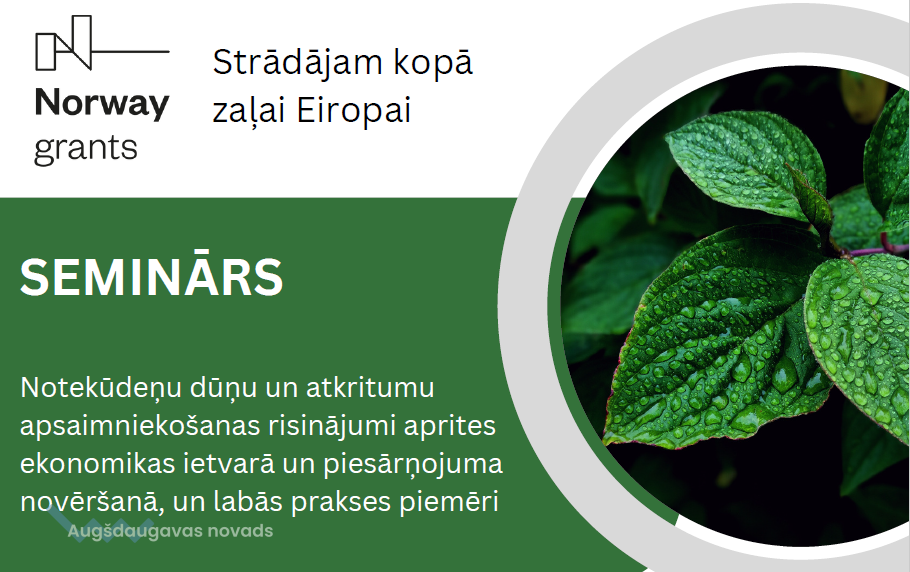 Aicinām pašvaldību vides speciālistus, komunālās saimniecības uzņēmumu pārstāvjus un citus interesentus piedalīties seminārā un iepazīties ar Divpusējās sadarbības fonda iniciatīvas “Atkritumu izgāztuvju un notekūdeņu dūņu izraisītā vēsturiskā piesārņojuma novēršana un teritoriju atgriešana apritē” ietvaros īstenotajām aktivitātēm. Norvēģijas vides speciālisti dalīsies pieredzē, akcentējot ilgtspējīgu risinājumu ieviešanu piesārņojuma mazināšanai un aprites ekonomikas veicināšanai. Seminārā arī tiks sniegta informācija par notekūdeņu dūņu apsaimniekošanas aktualitātēm Latvijā, un iekļautas tēmas par aprites ekonomikas principiem resursu saglabāšanā, notekūdeņu dūņu lomu bioloģiskos attīrīšanas procesos. ! ! ! Lai piedalītos seminārā, lūdzam reģistrēties līdz 2024.gada 19.novembrim šeit.