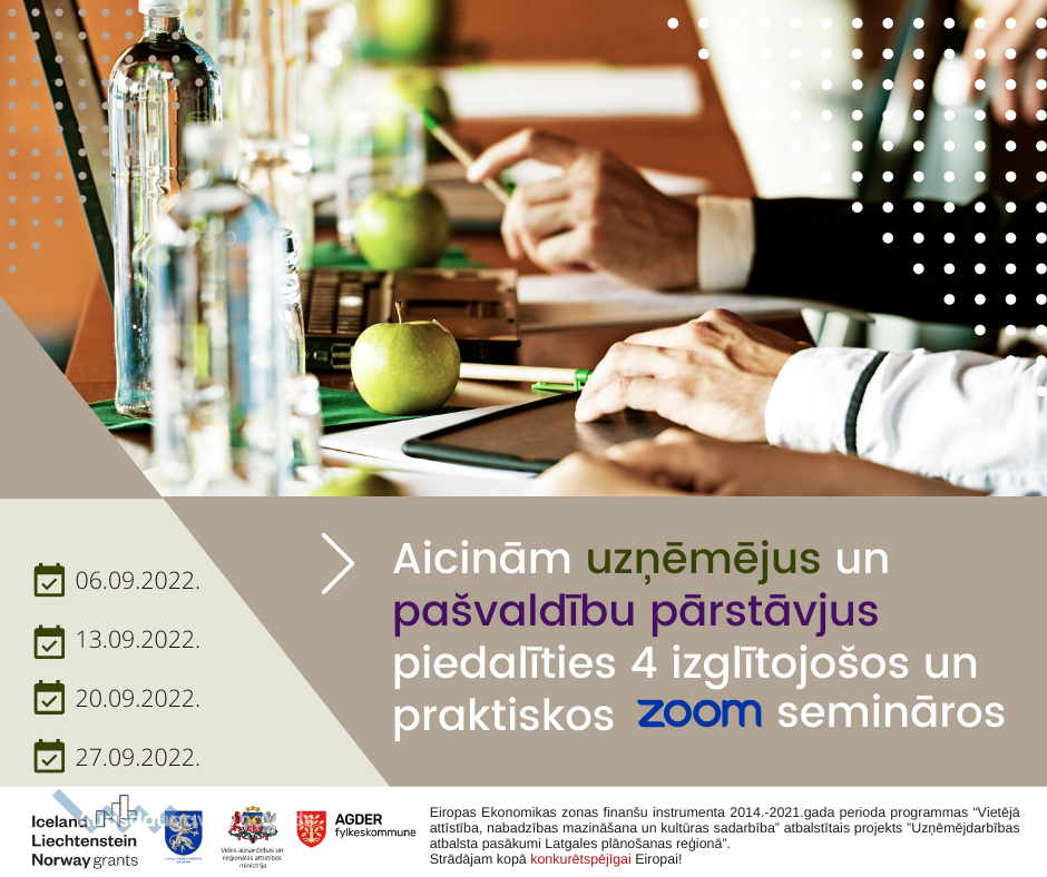 Semināri tiek rīkoti Eiropas Ekonomikas zonas finanšu instrumenta 2014.-2021.gada perioda programmas “Vietējā attīstība, nabadzības mazināšana un kultūras sadarbība” atbalstītā projekta ”Uzņēmējdarbības atbalsta pasākumi Latgales plānošanas reģionā” ietvaros. Strādājam kopā konkurētspējīgai Eiropai! #EEANorwayGrantsLatvia