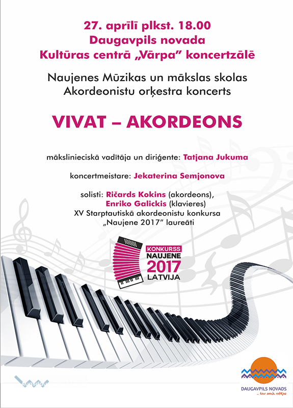 27. aprīlī plkst.18.00 Daugavpils novada Kultūras centrā “Vārpa” (Dobeles iela 30, Daugavpils) notiks Naujenes Mūzikas un mākslas skolas Akordeonistu orķestra koncerts “VIVAT - Akordeons”. Koncertā uzstājas solisti – Ričards Kokins (akordeons) un Enriko Galickis (klavieres). Mākslinieciskā vadītāja un diriģente – Tatjana Jukuma, koncertmeistare – Jekaterina Semjonova.