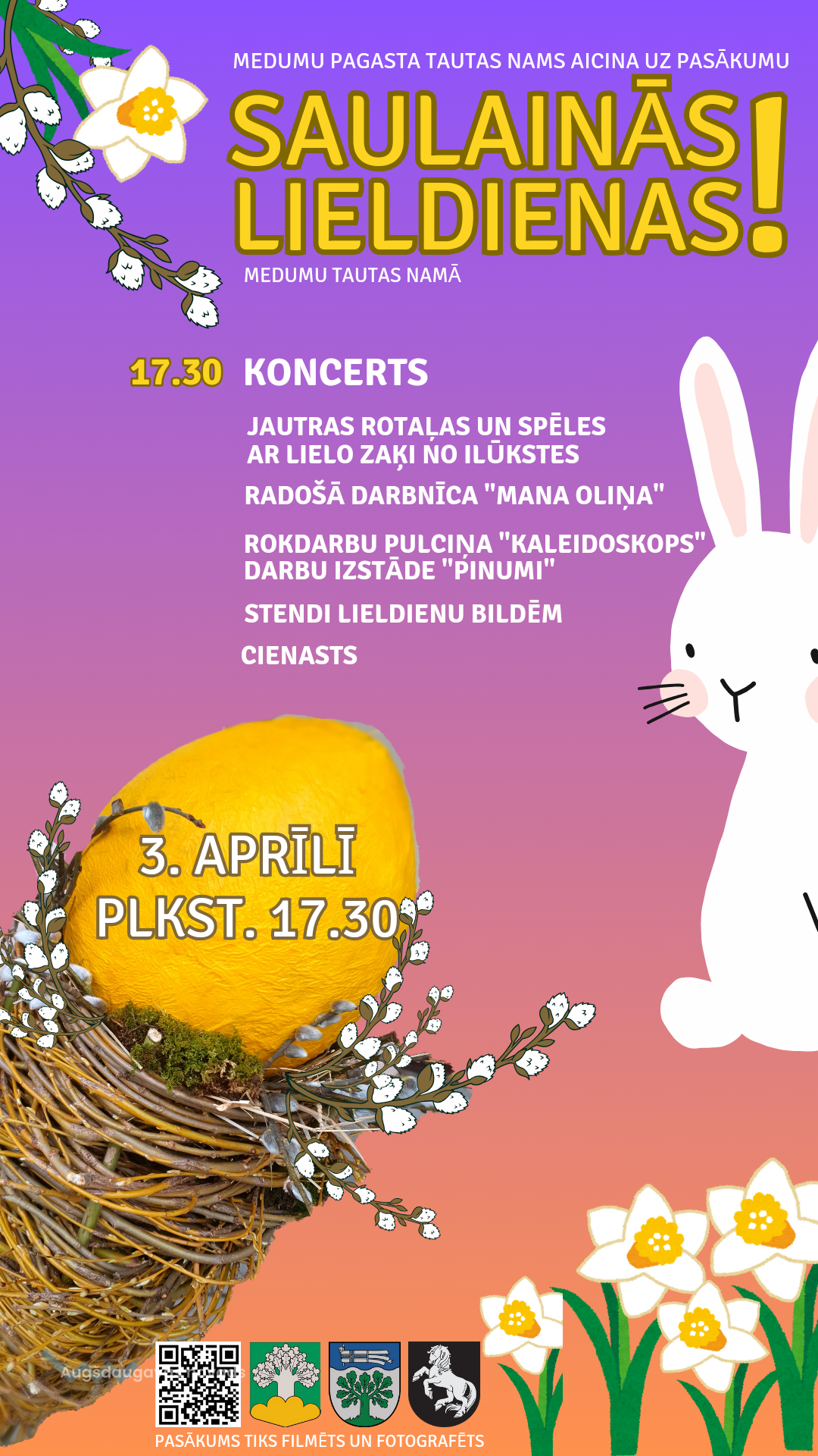 Turpināsim ar jautrām rotaļām un spēlēm, kuras vadīs Lielais Zaķis no Ilūkstes. Kā arī būs iespēja iepazīties ar Medumu rokdarbu pulciņa “Kaleidoskops” darbu izstādi “Pinumi” un piedalīties radošajā darbnīcā “Mana oliņa”.