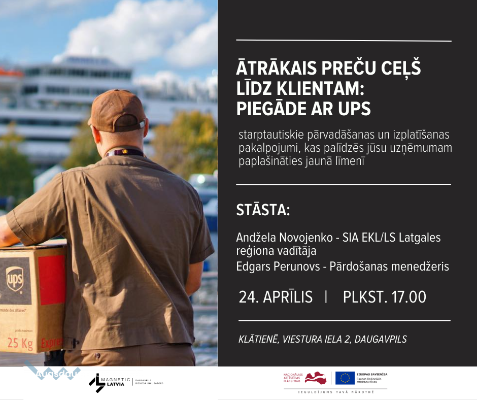 LIAA Daugavpils biznesa inkubators organizē semināru "Ātrākais preču ceļš līdz klientam: PIEGĀDE AR UPS", kas notiks pirmdien, 24. aprīlī, no plkst.17.00 līdz 18.00. Pasākuma mērķis ir iepazīstināt uzņēmējus un interesentus ar piegādes uzņēmuma UPS sniegtajām iespējām un priekšrocībām.