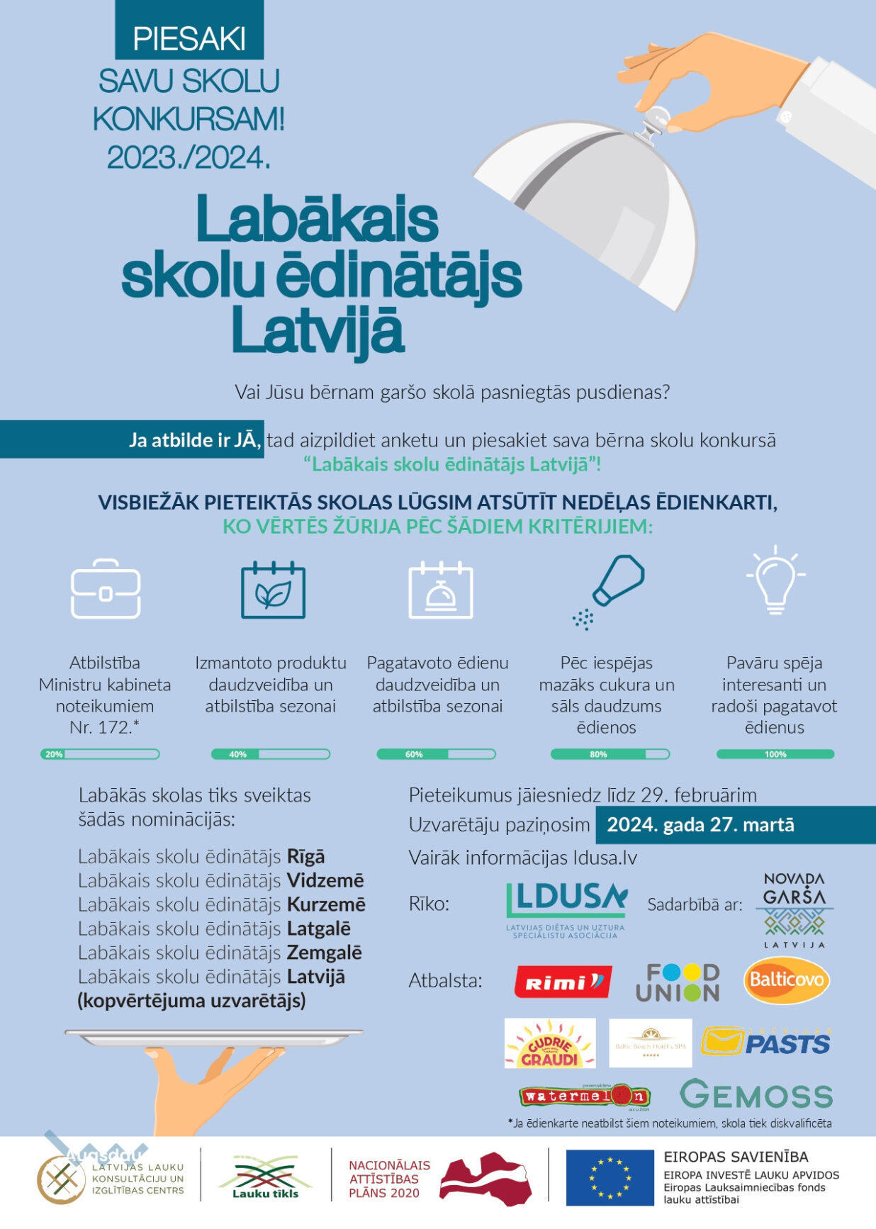 Vecāki ir aicināti skolas konkursā pieteikt no 5. līdz 29. februārim. Pēc tam visbiežāk pieteiktajām skolām LDUSA lūgs atsūtīt nedēļas ēdienkartes paraugu, ko izvērtēs konkursa žūrija. Uzvarētāji tiks noteikti sešās nominācijās jeb Vidzemē, Zemgalē, Kurzemē, Latgalē, Rīgā un visā Latvijā kopumā.