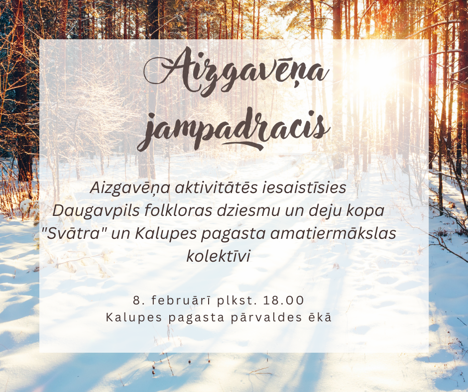 Aicinām 8. februārī plkst. 18.00 Kalupes pagasta pārvaldes ēkā uz pasākumu “Aizgavēņa jampadracis Kalupē”. Kopā ar Daugavpils folkloras dziesmu un deju kopu “Svātra” un Kalupes pagasta folkloras kopu “PylnaSāta” dejosim, dziedāsim, iesim rotaļās, piedalīsimies aktivitātēs un baudīsim aizgavēņa ēdienus.