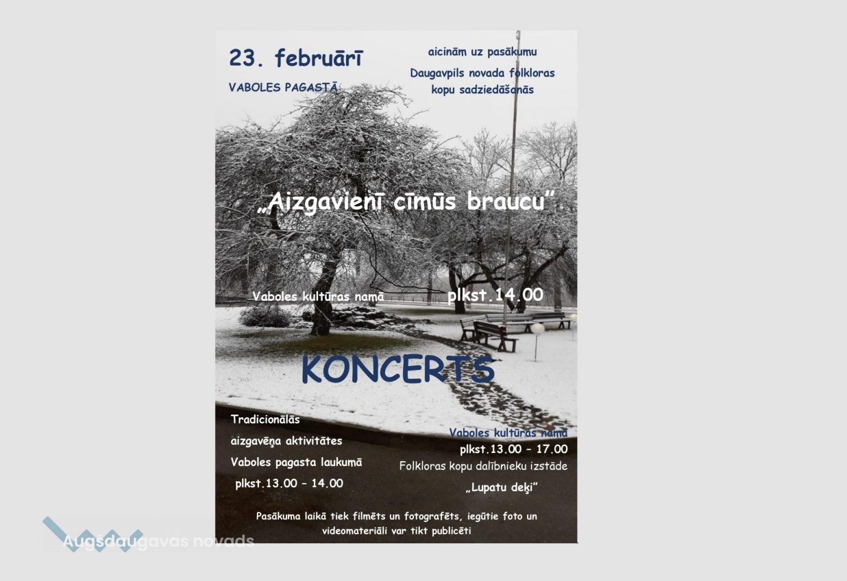 23. februārī Vaboles pagastā notiks folkloras kopu sadziedāšanās "Aizgavienī cīmūs braucu". Pl. 13.00 aizgavēņa aktivitātes Vaboles pagasta laukumā, no pl. 13.00 Vaboles kultūras namā folkloras kopu dalībnieku izstāde "Lupatu deķi", pl. 14.00 koncerts.