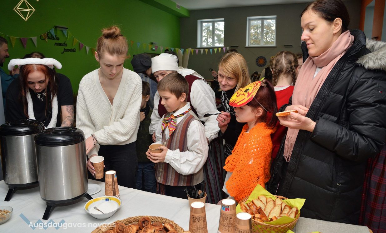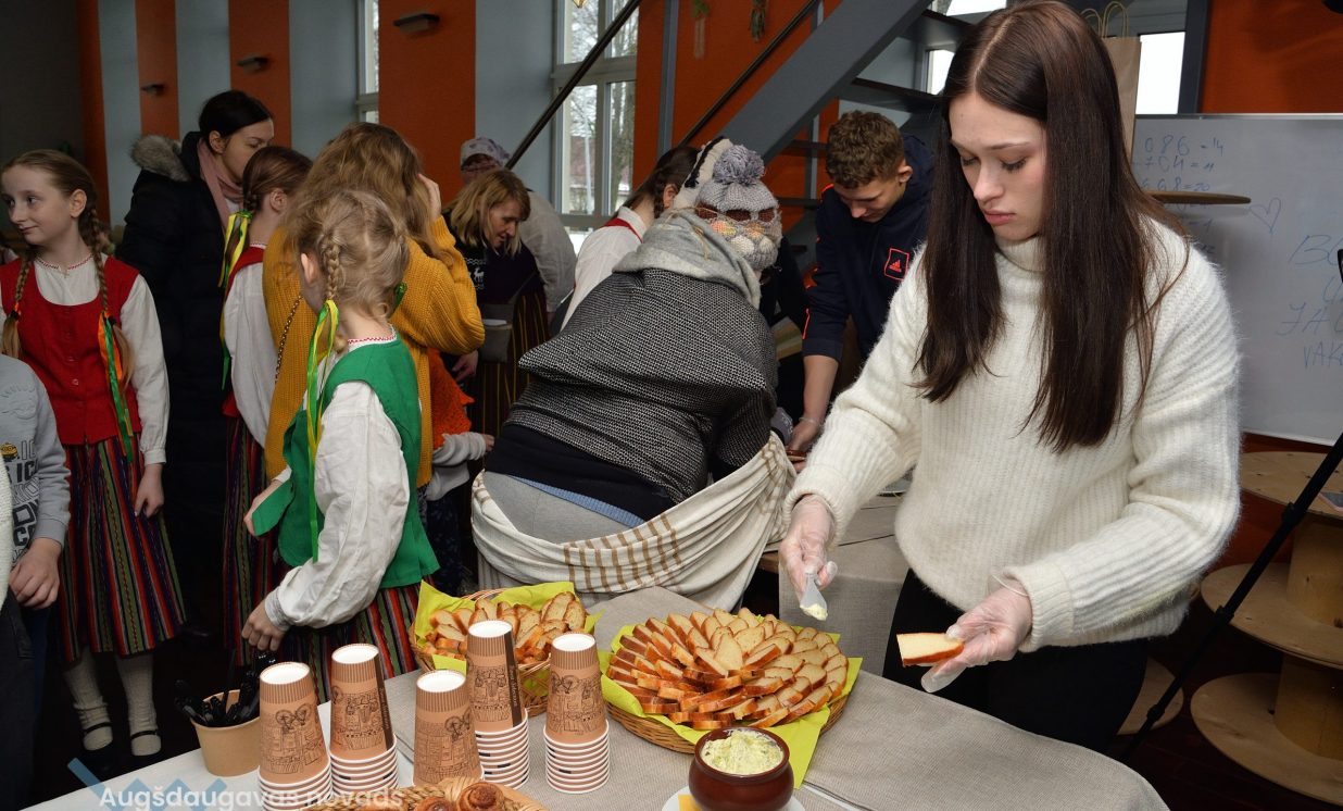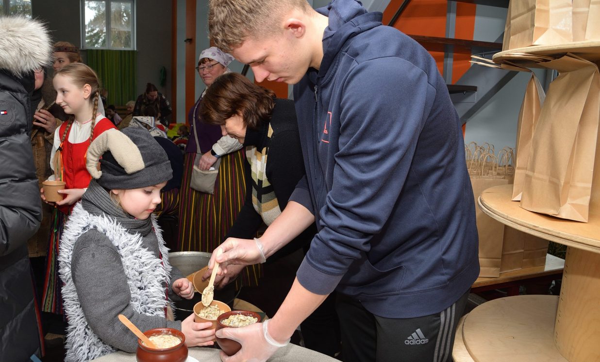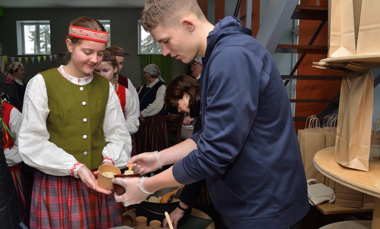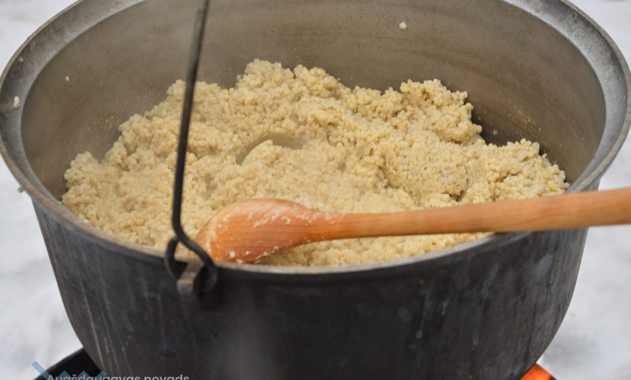 Ļoti svarīga Aizgavēņa svētku sastāvdaļa ir cienasts, kam jābūt ļoti sātīgam un dāsnam, lai var atēsties pirms Lielā gavēņa. Parasti saimnieces galdā likušas grūbu biezputru, zirņus, mājas sierus, pīrāgus, speķi, maizi un citus gardumus. Arī šoreiz cienasts neizpalika. Ikviens varēja nobaudīt uz ugunskura vārītu grūbu biezputru ar speķa vai sēņu mērci, pašceptu maizi un smalkmaizītes, klāt uzdzerot veselīgu zāļu tēju.