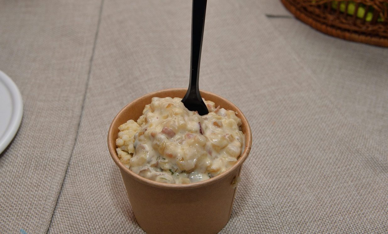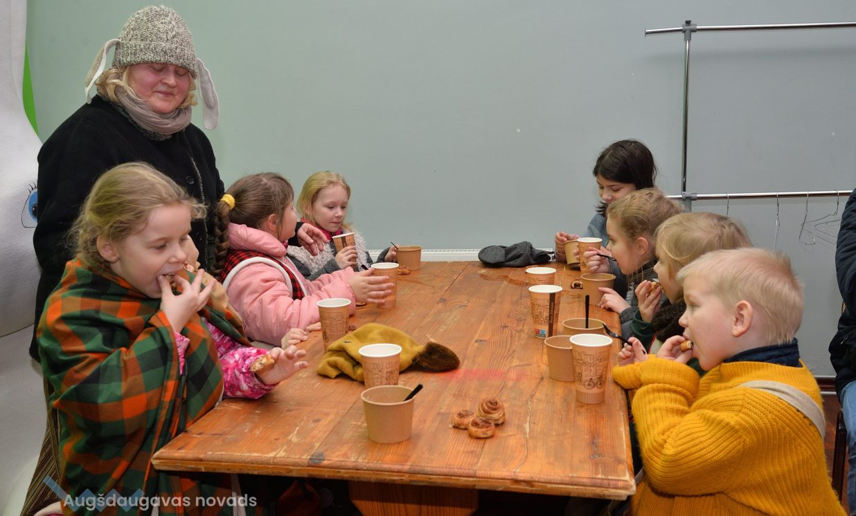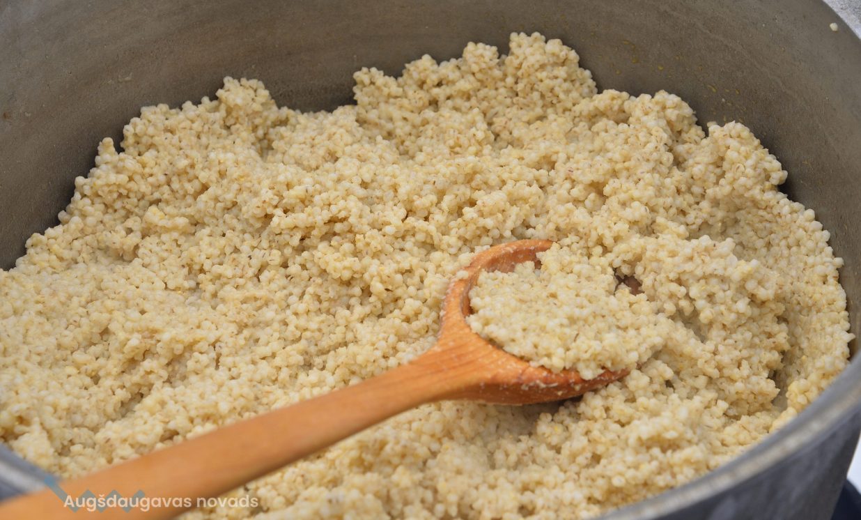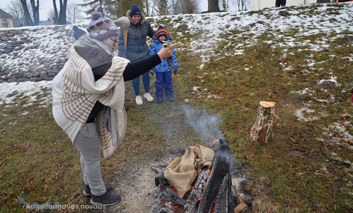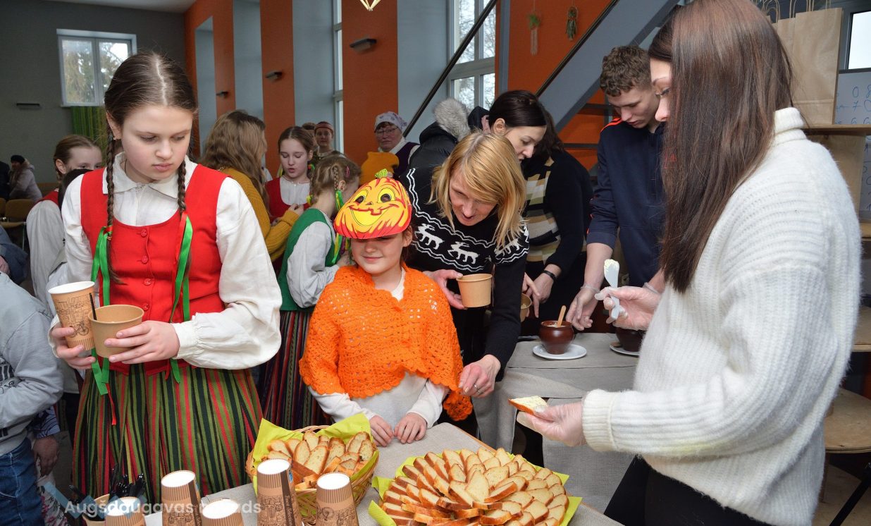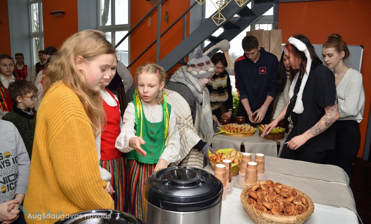 Ļoti svarīga Aizgavēņa svētku sastāvdaļa ir cienasts, kam jābūt ļoti sātīgam un dāsnam, lai var atēsties pirms Lielā gavēņa. Parasti saimnieces galdā likušas grūbu biezputru, zirņus, mājas sierus, pīrāgus, speķi, maizi un citus gardumus. Arī šoreiz cienasts neizpalika. Ikviens varēja nobaudīt uz ugunskura vārītu grūbu biezputru ar speķa vai sēņu mērci, pašceptu maizi un smalkmaizītes, klāt uzdzerot veselīgu zāļu tēju.