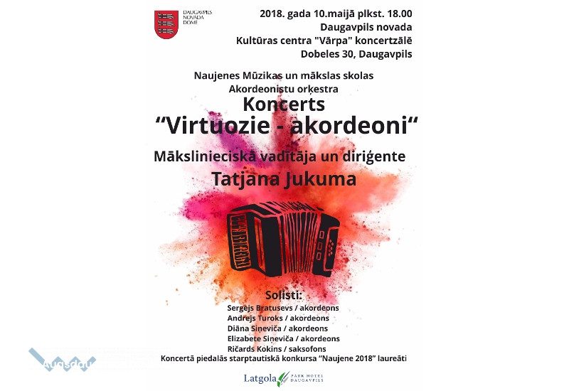 Akordeonistu orķestra koncerts “Virtuozie – akordeoni”08.05.2018AKTUĀLI 10. maijā plkst. 18:00 Daugavpils novada Kultūras centrā "Vārpa" notiks Naujenes Mūzikas un mākslas skolas Akordeonistu orķestra koncerts "Virtuozie - akordeoni".