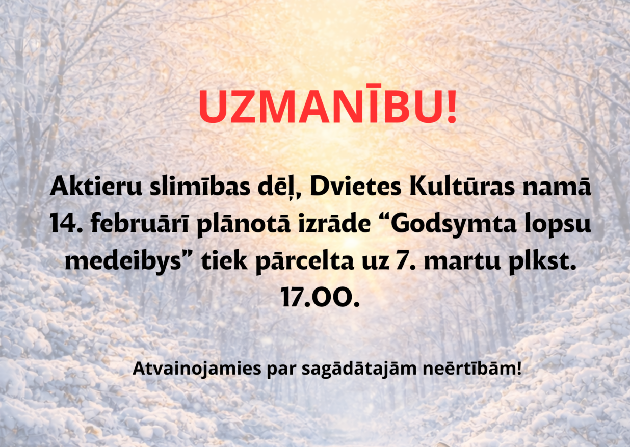 14. februārī plānotais "Maskas" iestudējums Dvietes Kultūras namā "Godsymta lopsu medeibys" aktieru slimības dēļ pārcelts uz 7. martu plkst. 17.00!