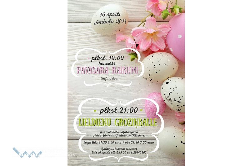 16.aprīlī Ambeļu kultūras nams piedāvā iespēju kopā ar ģimenēm un draugiem siltā un gaišā noskaņā nosvinēt Lieldienas. Aicinām visus izšūpoties Lieldienu šūpolēs, kas iekārtas pagasta centrā, sakrāsot skaistas olas, izbaudīt pavasara pastaigu Ambeļu pakalnos. Savukārt vakarā kultūras nama zālē piedāvājam izbaudīt koncertu un lustīgi izdejoties groziņballē.
