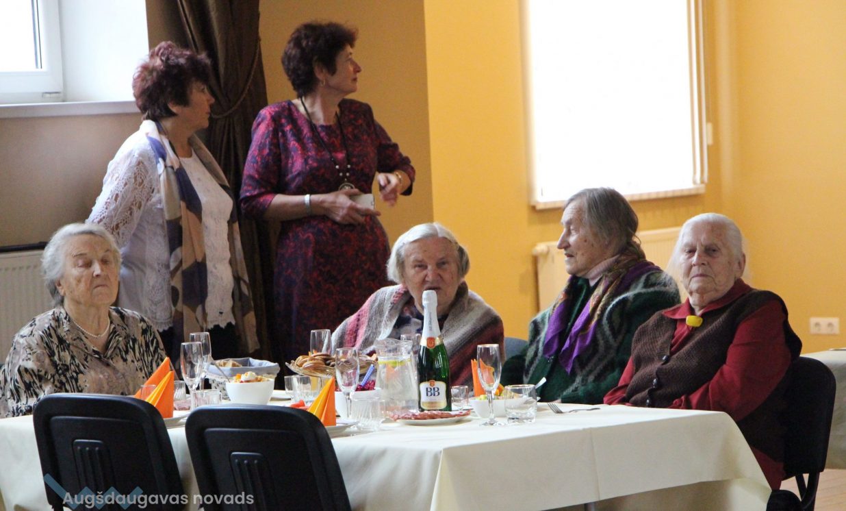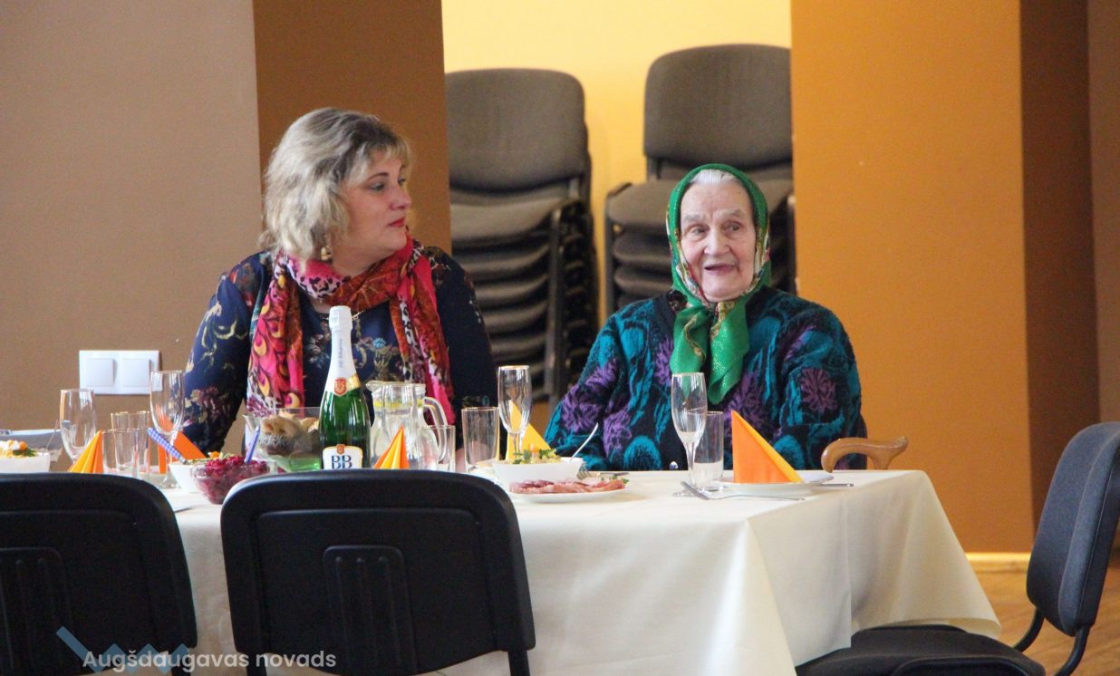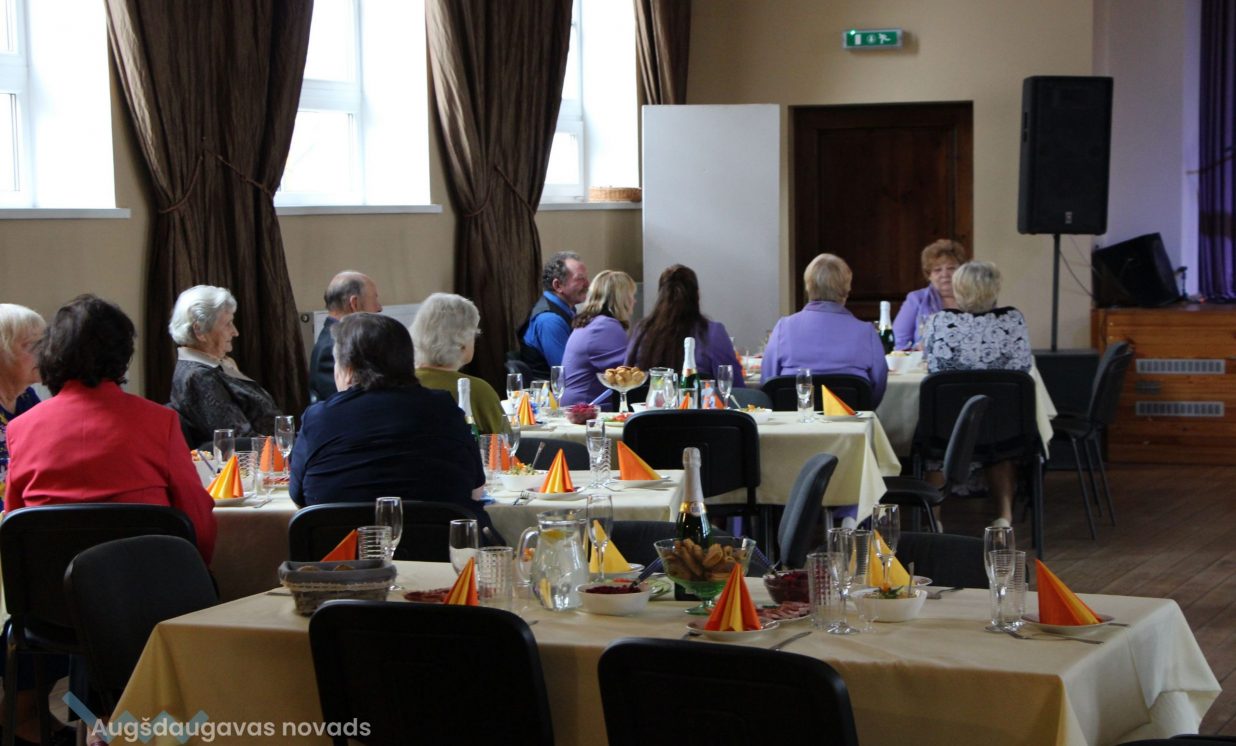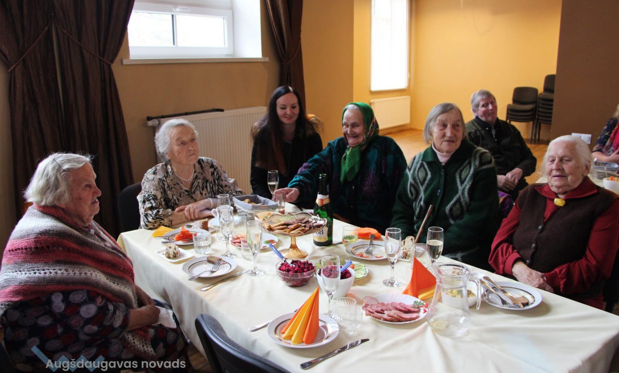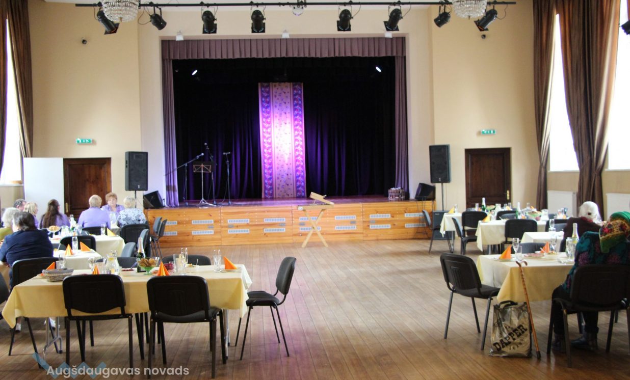 Ambeļu kultūras nama zālē seniorus gaidīja uzklāti galdiņi ar cienastu, kuru sagatavoja Ambeļu pagasta iestāžu darbinieki, pateicoties Daugavpils novada domes un pagasta pārvaldes finansējumam.