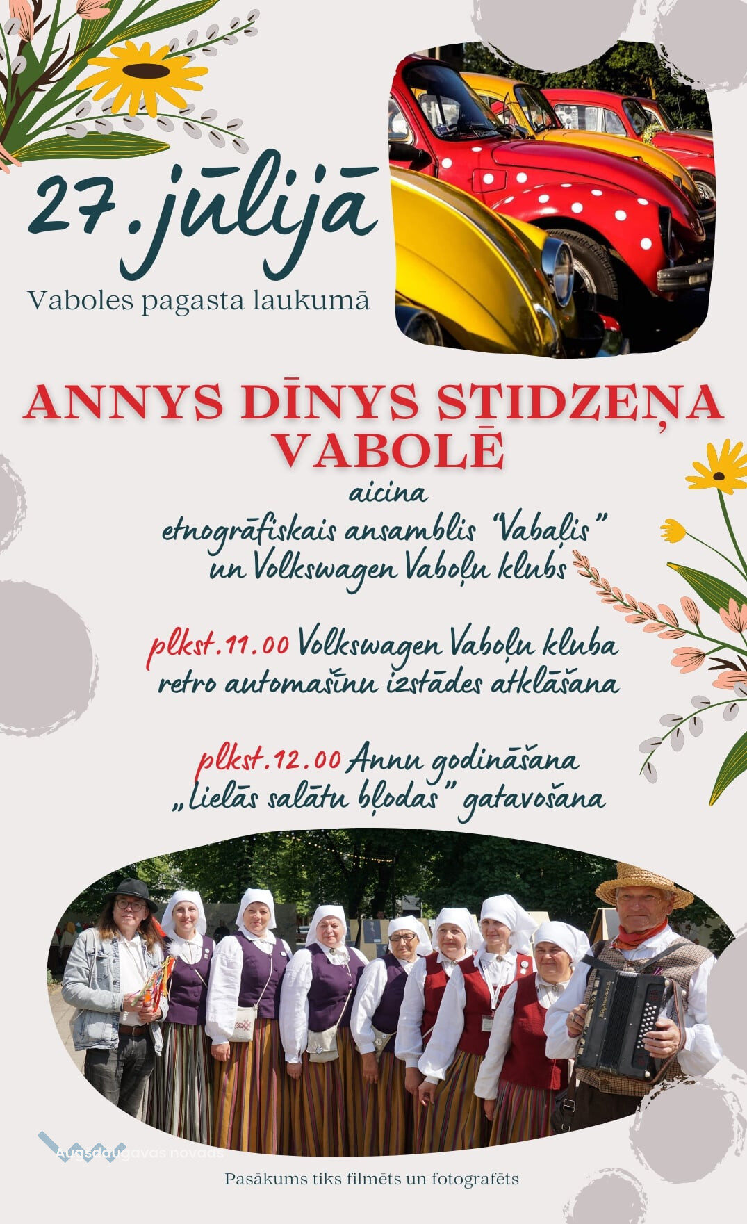 “Annys dīnys stidzeņā” šoreiz satiksies tradicionālas un klasiskas vērtības – etnogrāfiskais ansamblis “Vabaļis” godinās Annas un visus ielustēs ar savām Vaboles pagastā sakņotajām dziesmām. VW Vaboļu klubs jau otru reizi priecēs automīļus Vabolē ar retro automašīnām, savukārt Annas gatavos un cienās visus no „Lielās salātu bļodas”. Ābeļdārzā pie kultūras nama būs skatāma izstāde “Ziedi Annas dienā”.