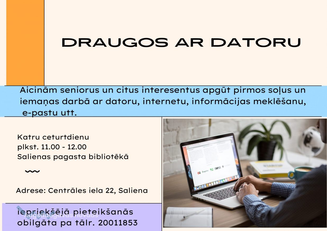 Laipni lūgti seniori un visi interesenti Salienas pagasta bibliotēkā un Salienas pagasta bibliotēkas Vecsalienas nodaļā apmācībai “Draugos ar datoru”. Mēs piedāvājam apgūt pirmos soļus un iemaņas darbā ar datoru, internetu, informācijas meklēšanu, e-pastu, Facebook utt.