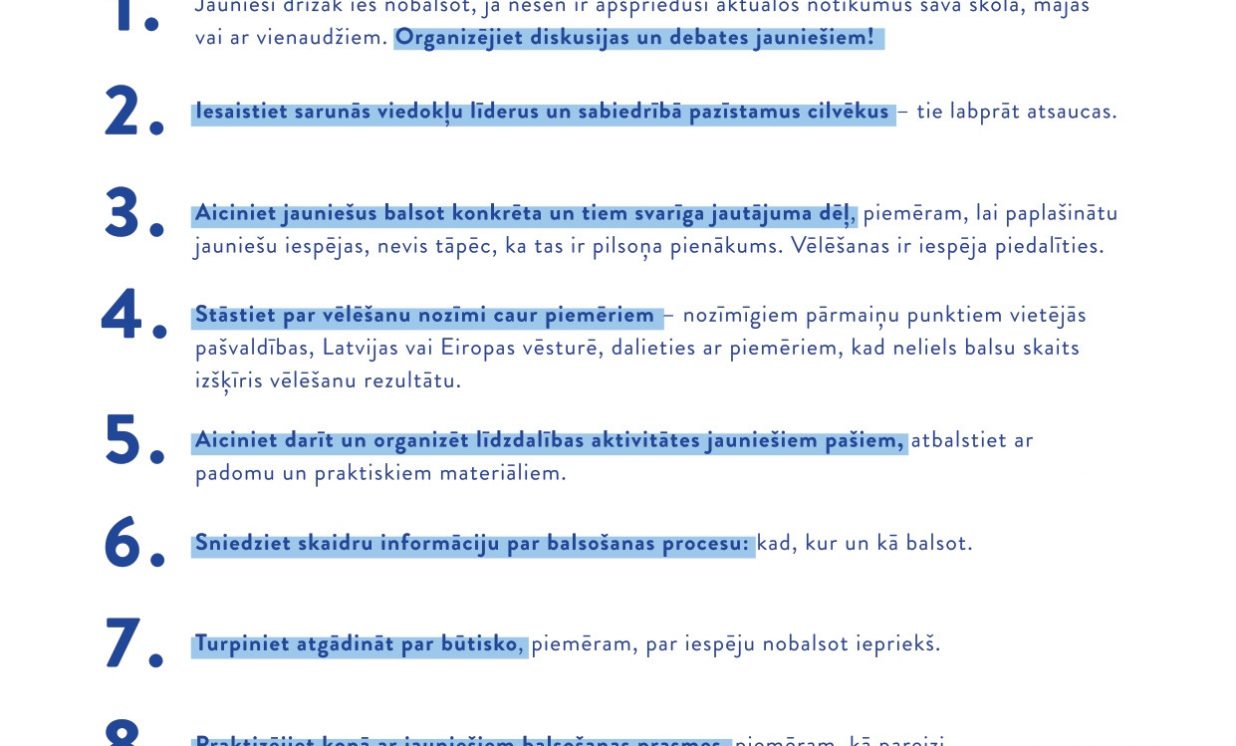 “Kad mēs kaut ko darām pirmo reizi, tas vienmēr ir satraucoši, reizēm mēs baidāmies kļūdīties, nezinām, kā rīkoties, un reizēm šķiet, ka vieglāk ir nedarīt, nekā darīt. Šādās reizēs ļoti palīdz iedrošinājums. Dalība vēlēšanās nav izņēmums. Ir svarīgi iedrošināt jauniešus līdzdarboties lēmumu pieņemšanā un piedalīties vēlēšanās, lai arī jauniešu viedoklis un vajadzības, veidojot politiku, lemjot par valsts, pašvaldības vai Eiropas nākotni, tiktu ņemti vērā. Turklāt, jo vairāk jauniešu piedalīsies vēlēšanās, jo nozīmīgākas viņu balsis kļūs arī politikas veidotājiem. Piedaloties vēlēšanās, mēs varam likt sevi sadzirdēt,” uzsver Centrālās vēlēšanu komisijas priekšsēdētāja Kristīne Bērziņa.