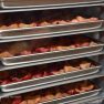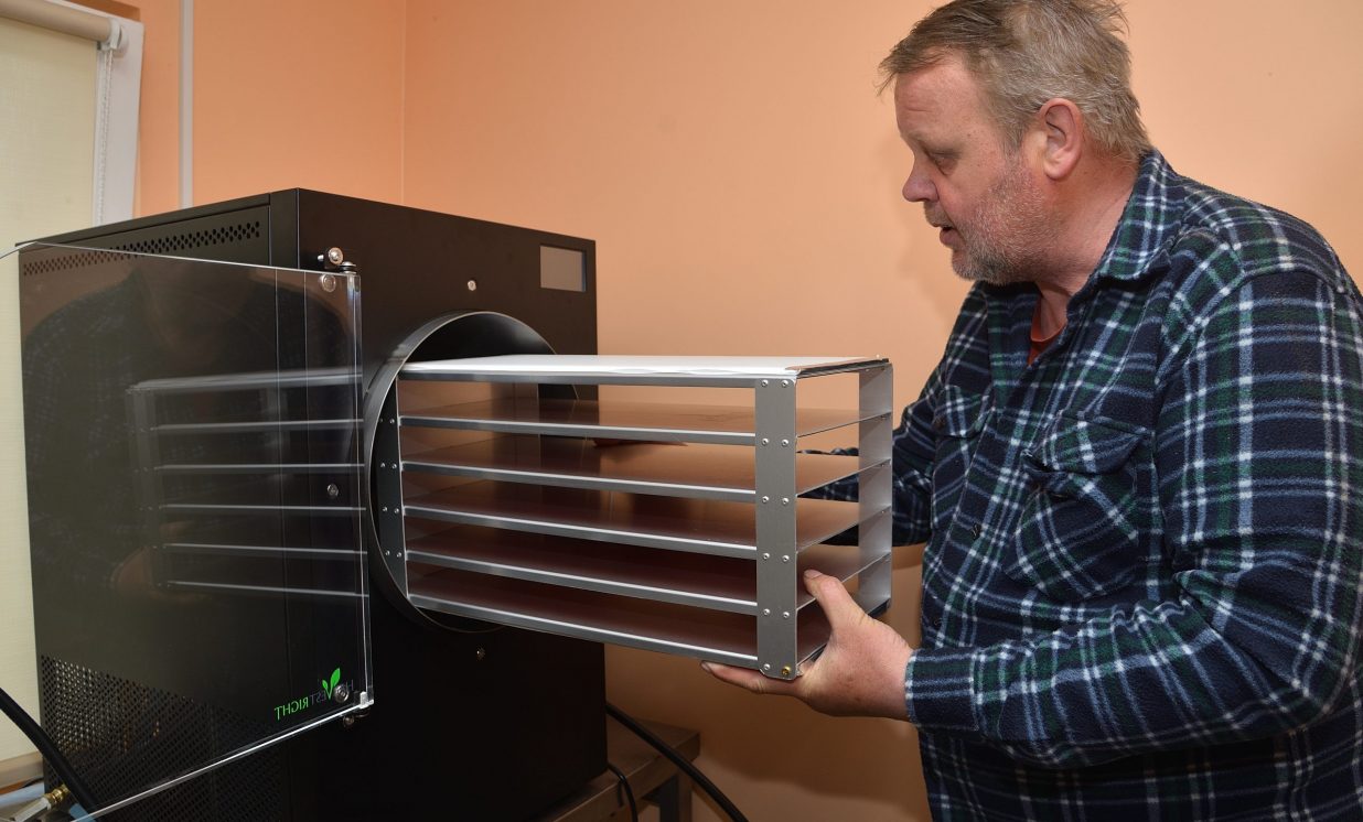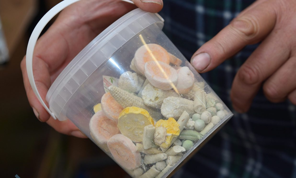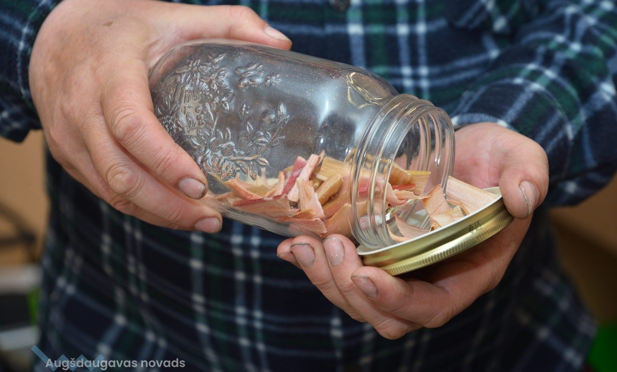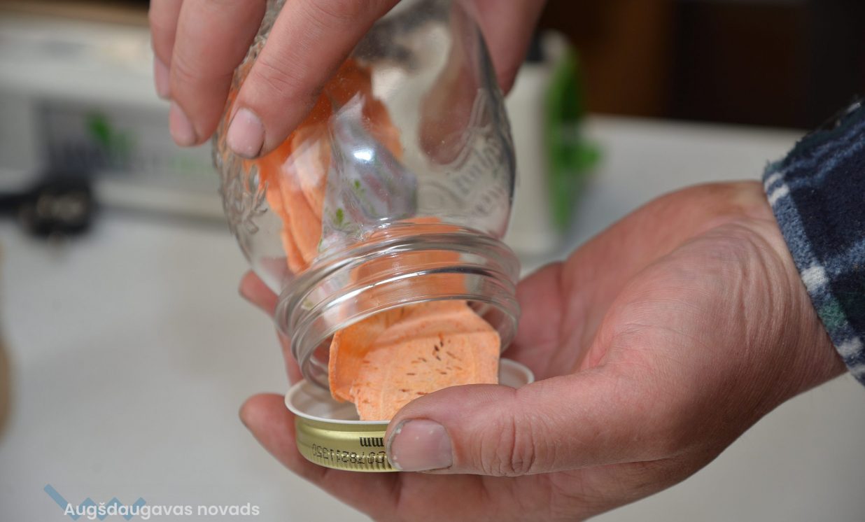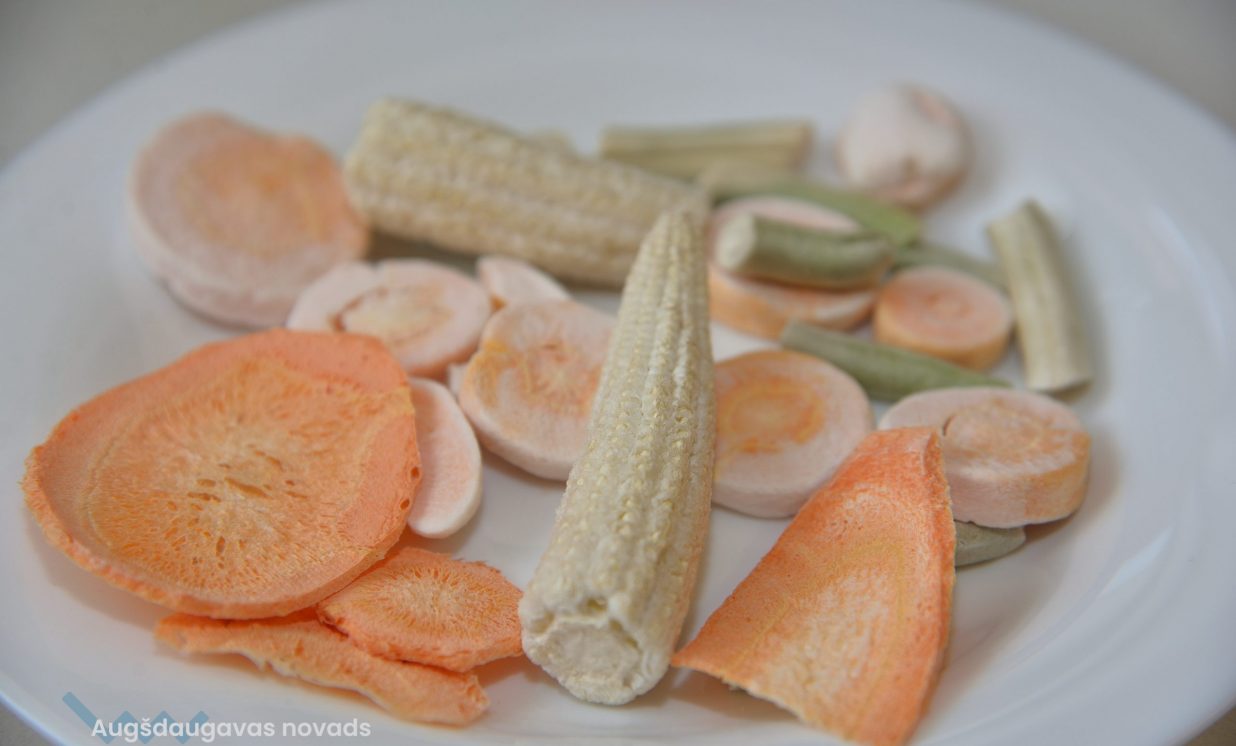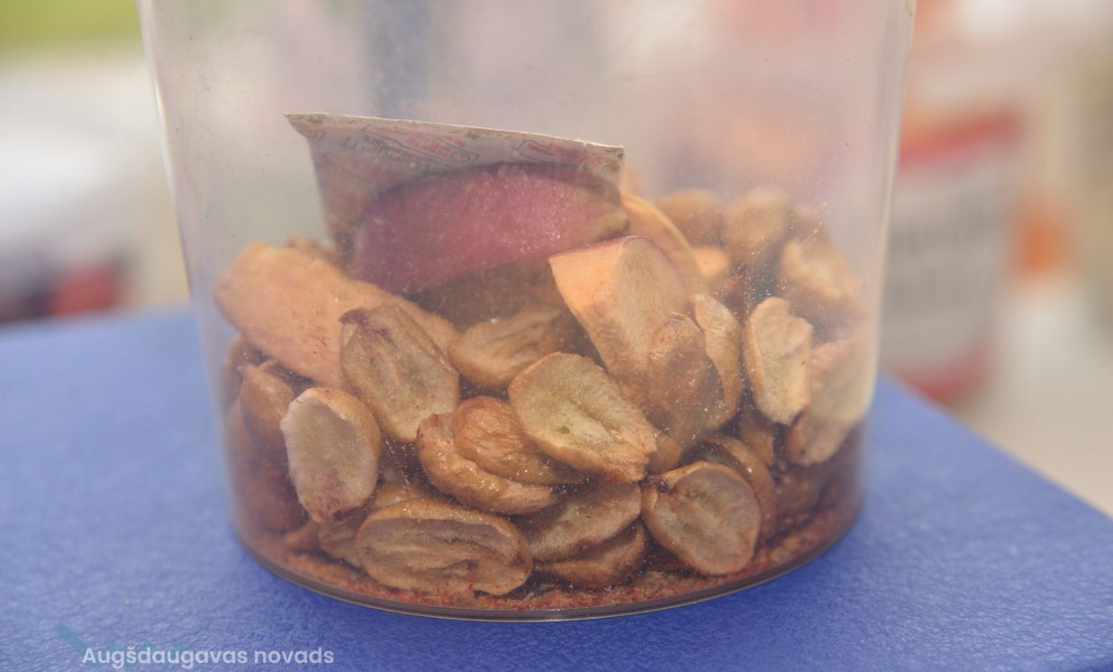 Iekārtas darbojas vien mēnesi, bet ražošanas telpā jau kastēs krājas jaunā produkcija. Tā fasēta gan īpašos papīra iepakojumos, gan plastmasas spainīšos, no kuriem pretī kārdinoši raugās zemenes, avenes, kivi, plūmes un citi pašmāju un eksotiskie gardumi. Lielākoties iekārtās nonāk pašu dārza raža, tostarp daudzveidīgi dārzeņi, ko var grauzt tāpat vai likt zupās. Normunds stāsta, ka izkaltētie dārzeņi vai augļi, nonākot ūdenī, piebriest un garšojot kā nupat plūkti dārzā. “Ja zupu uzreiz neapēd, uzlej uz paplātes un liec iekārtā, tad maisiņā un pēc tam atkal vari ēst.” Burkānus mēģina kaltēt dažādā formā – gan salmiņos, gan kā čipsus graušanai. Ļoti izteikta garša ir rabarberu čipsiem, tos gan pirms kaltēšanas izmērcē cukura sīrupā. Visgrūtāk kaltējas ogas ar vaska kārtiņu – dzērvenes, mellenes, brūklenes, tās pirms kaltēšanas vajag fiziski traumēt, pāršķeļot miziņu, lai kaltējot mitrums tiek laukā, tāpēc talkā nāk parastā grila tīrīšanas birste vai zirgu suka.