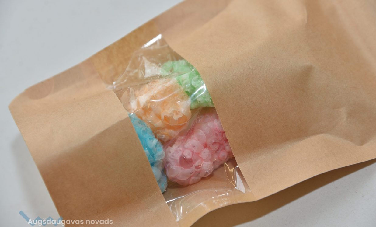 Eksperimentējot pamēģinājuši izkaltēt arī pirkto sieru, kas sanāk gards kā čipsi, tāpēc ir doma gatavot Jāņu dienas našķus. Izrādās, sublimēt var pat saldējumu, kas gatavā veidā izskatās pēc zefīra, taču ir kraukšķīgs un mutē kūstošs gardums. “Es jau sievai saku, ka ielikšu iekšā savu čību paskatīties, kāda tā sanāks,” smejas Normunds un rāda iesaiņojumu ar krāsainiem popkornam līdzīgiem kraukšķiem. Tas ir viens no saimnieku eksperimentiem, kas īpaši garšojot bērniem, - sublimētas želejkonfektes.