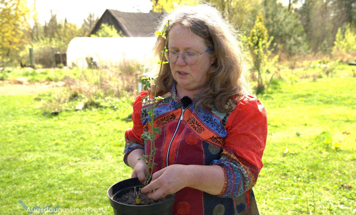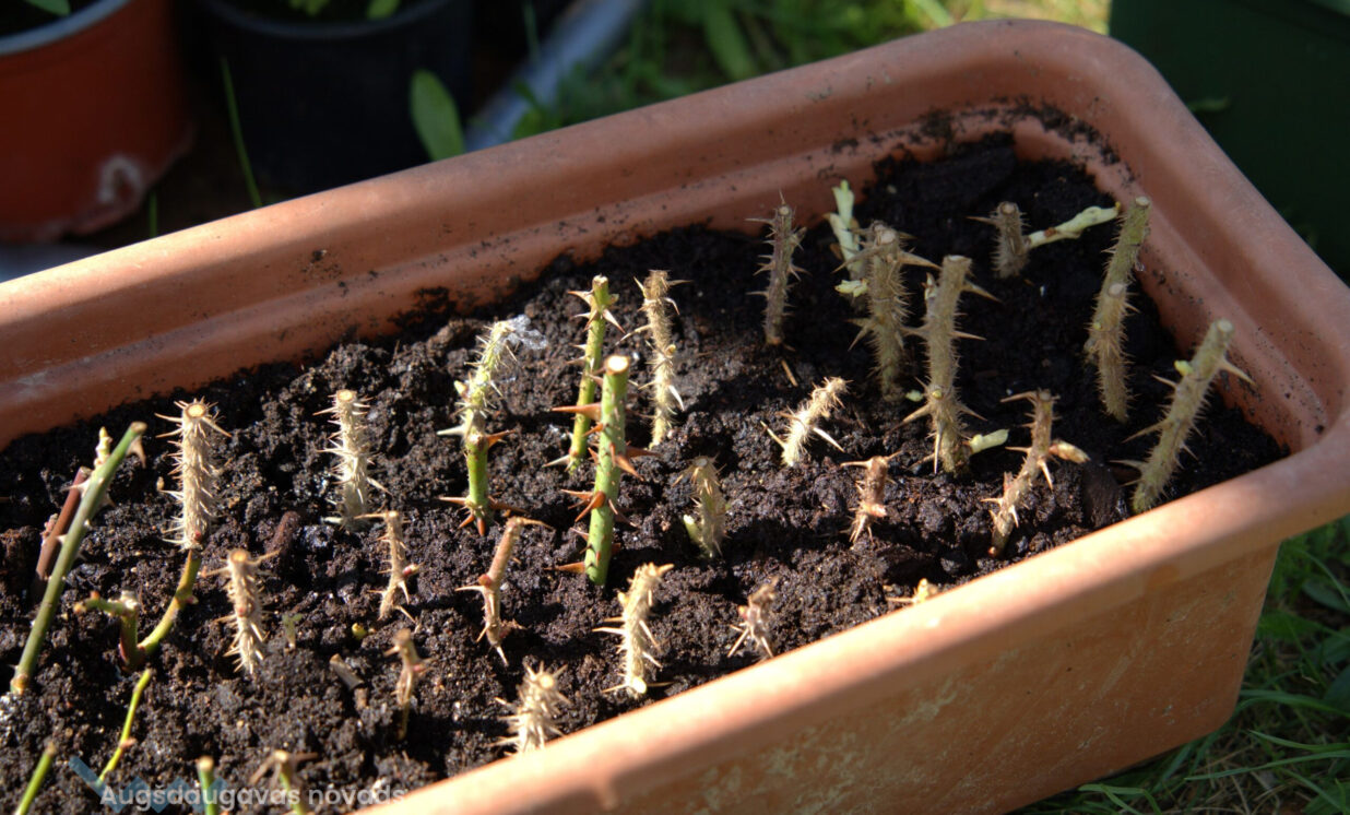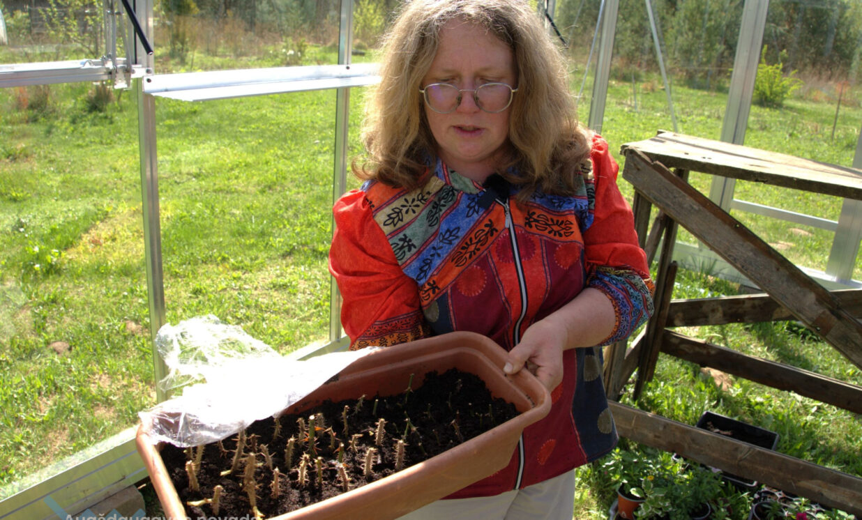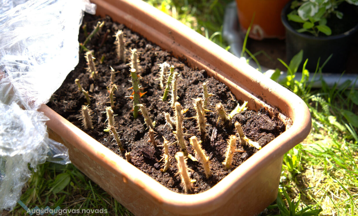 “Šī ir audzēšana no spraudeņiem. Iepriekšējā gadā no Salaspils rožu dārza kolekcijas es iegādājos potzarus, tie ir izziemojuši, ar pumpuriem. Tie tiek iemērkti augšanas stimulatorā un cenšas dzīt saknītes. Tas ir tāds mans eksperiments,” stāsta Jolanta un nodemonstrē mazos iesakņotos rožu stādus. Rozes viņa pavairo arī ar potēšanu, uz mežrožu potcelmiem uzpotējot kādu izturīgu rozes šķirni, kas labi pārcieš Latvijas ziemas. “Tas notiek tā – mežroze tiek apgriezta, tai nav iespējas dot ārā savus dzinumus. Un uz šī apgrieztā potcelma piesprauž klāt šķirnes rozi. Lielākā daļa šķirnes rožu aug uz svešām kājiņām, uz spēcīgas mežrozes saknes aug virsū maigākas šķirnes rozīte.”
