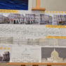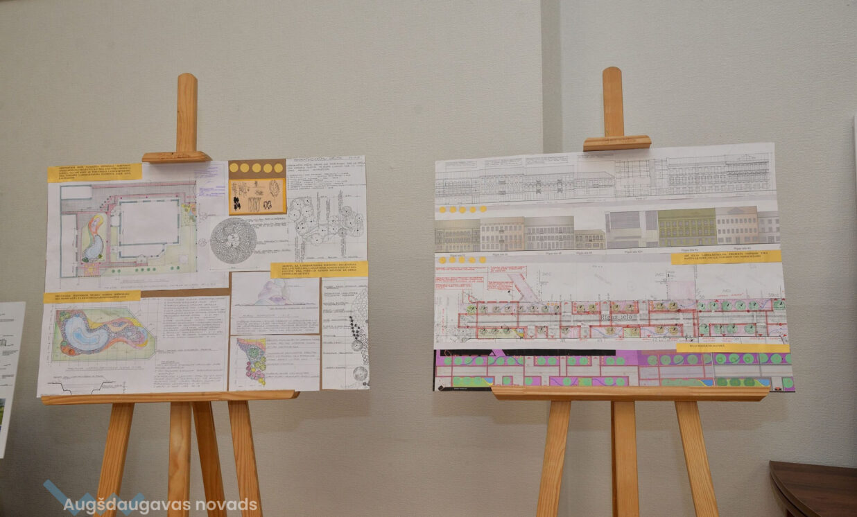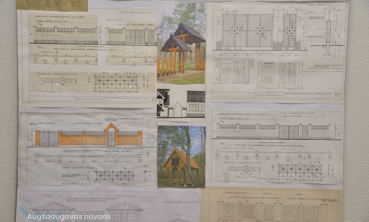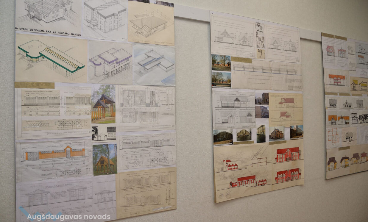 “Esam no pagājušā gadsimta, palikuši pēdējie, kas vēl rasē ar roku, jo jau gadus 20 tas tiek darīts ar datoru, tāpēc gribējām parādīt tās tehnikas un iespējas, ar kurām mēs strādājam,” teic Ģertrūde, kura arhitektes gaitas uzsāka 1974. gadā. Uz viena no stendiem redzama viņas diplomdarba titullapa, rakstīta ar roku ideāli glītā drukas rakstā, kas tapis ar šablonu palīdzību. Nezinātājs noteikti nodomātu, ka tas ir datorraksts. Augstskolā Ģertrūde apguvusi vairākus rokraksta veidus, ko agrāk izmantojusi ne tikai darbā, bet arī dažādu ielūgumu, apsveikumu un galda karšu izgatavošanā. “Mums studijās divus gadus bija burtu mācība, bija jāapgūst desmit šrifti – gotu, kaligrāfiskais, tehniskais, speciālais drukāšanas šrifts, arhitektoniskais un bija jāizdomā personīgais šrifts. Rakstāmmašīna bija jau solis uz priekšu. Kad atnācu strādāt, mums bija drausmīga klaboša mašīna, uz kuras mēs drukājām. Projektēšanu toreiz sākām ar četru krāsu zīmuļu komplektu. Tika izmantoti dažnedažādi varianti, mēs gan šķīdinājām kālija permanganātu, lai dabūtu brūnus toņus, gan akvareļkrāsas izmantojām. Vēlāk, pēc gadiem 10, parādījās flomāsteri, tad bliezām visu sarkanu, cik vien var krāsainu visu, oranžu. Arī materiāli agrāk tika izmantoti dažādi – papīrs, lavsāns, impregnēts audums.” Interesanti, ka visas dokumentu kopijas agrāk tika veidotas bez kopējamām mašīnām, jo tādu nemaz nebija. Kartes tika izgatavotas vairākos eksemplāros. “Kad sāku strādāt, kopijas tika taisītas ļoti interesantā veidā. Mēs rasējām uz caurspīdīgajām tušas un zīmuļu pauzēm, pēc tam tās izgaismojām, likām kastē, kur apakšā bija lampas, virsū bija stikls, uz kura uzlikām savu rasējumu un virsū gaismas jūtīgo papīru. Minūtes 5-10 turējām, pēc tam sarullējām, un sekretāre ātri skrēja uz speciālo melno kabinetu, kur vienā skapī lika šos rasējumus, kas attīstījās ar ožamo spirtu. Tautas valodā tās sauca par siņkām. Bija arī cits veids – ar zīmuli rasēto caur stiklu uz kaļkas pārvilka ar tušu,” Ģertrūde aizraujoši stāsta par dažādām tehnoloģijām, ko arhitekti agrāk pielietoja savā ikdienas darbā.