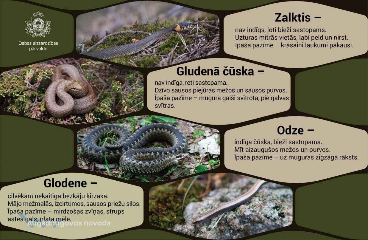 Vasaras baudīšanu ūdens tuvumā iecienījuši ne vien cilvēki, bet arī rāpuļi, tostarp čūskas. No trim Latvijā esošajām čūsku sugām ezeru, upju un mitru vietu tuvumā visbiežāk redzams zalktis Natrix natrix – cilvēkam nekaitīga čūska ar krāsainiem pusmēnešiem pakauša rajonā, ko cilvēki sauc par ausīm.