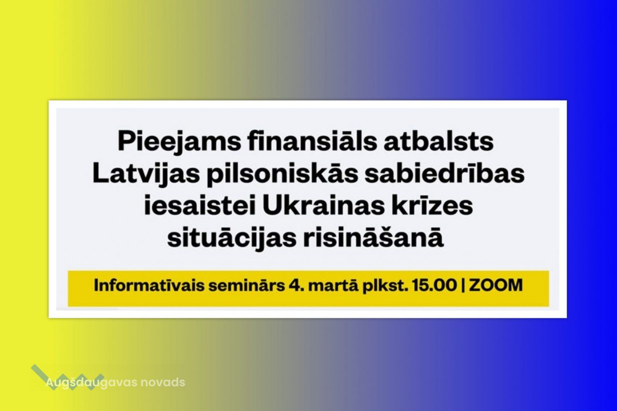 Aktīvo iedzīvotāju fonds (AIF) sadarbībā ar Sabiedrības integrācijas fondu (SIF) aicina uz semināru par finansiālā atbalsta iespējām Latvijas nevaldības organizācijām, kas vēlas iesaistīties Ukrainas krīzes situācijas risināšanā. Seminārs notiks 2022. gada 4. martā plkst. 15.00 Zoom platformā.
