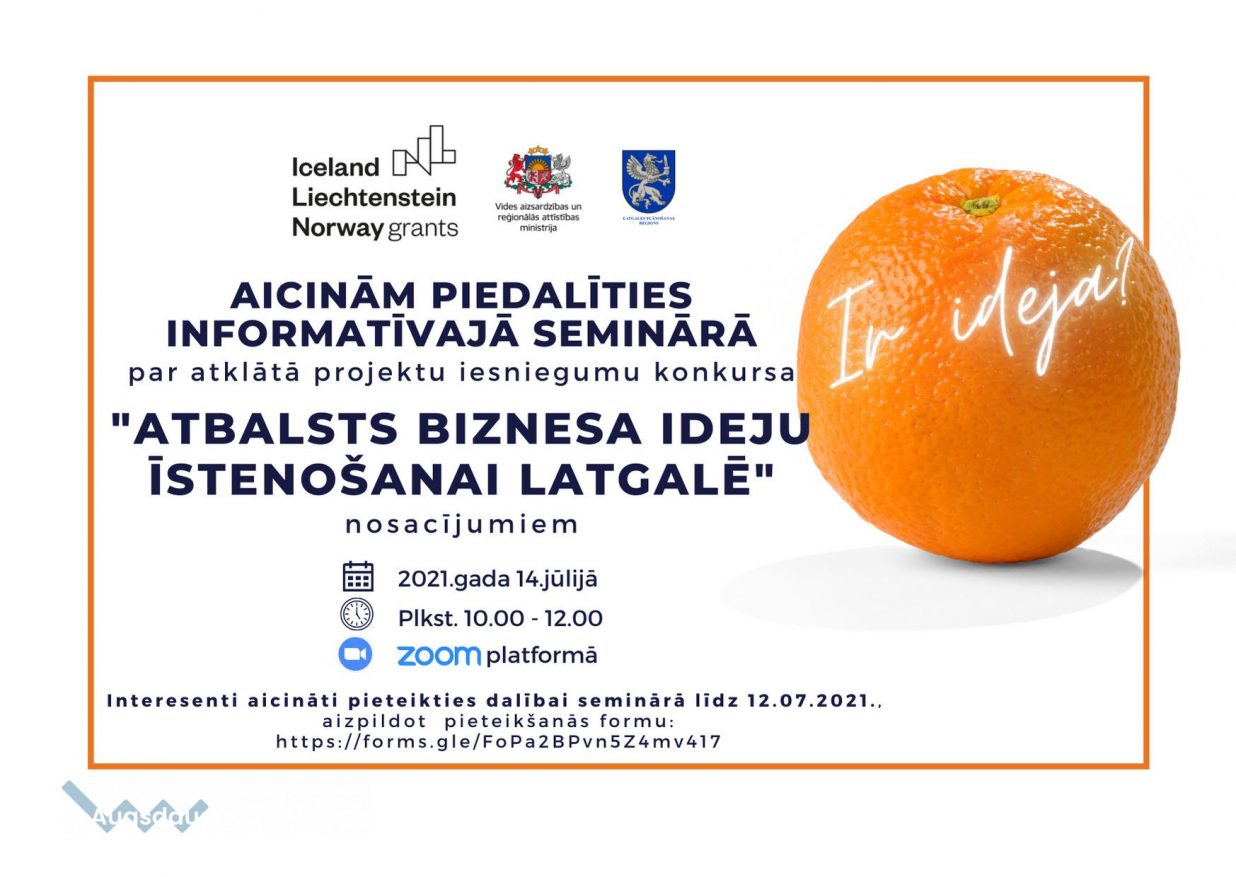 2021.gada 14.jūlijā no plkst. 10:00 līdz 12:00 ZOOM platformā notiks informatīvais seminārs, kurā Latgales plānošanas reģions iepazīstinās ar EEZ FI 2014. – 2021.gada perioda programmas “Vietējā attīstība, nabadzības mazināšana un kultūras sadarbībā” neliela apjoma grantu shēmas atklātā projektu iesniegumu konkursa “Atbalsts biznesa ideju īstenošanai Latgalē” nosacījumiem.