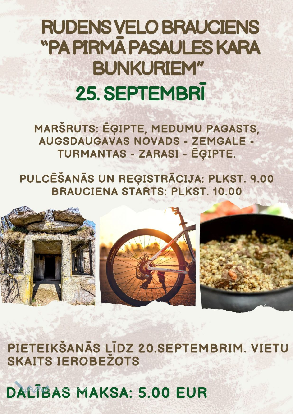Savu dalību aicinām pieteikt līdz šā gada 20. septembrim, aizpildot pieteikuma anketu ŠEIT. Dalībnieku vietu skaits ir ierobežots. Brauciena laikā būs iespēja piedalīties ekskursijā, kuru vadīs zinošs gids, kā arī velo maršruta atklāšanas pasākuma noslēgumā “kara lauka virtuve” piedāvās baudīt pusdienas īstā bunkurā. Dalības maksa: 5.00 eur/pers.