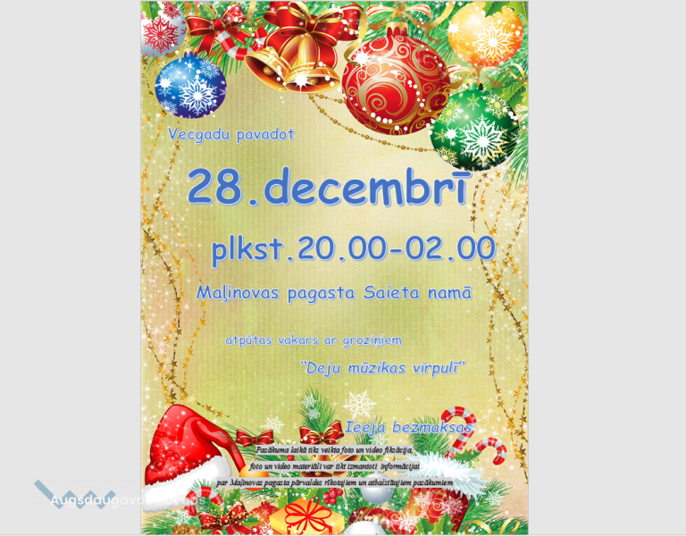 28. decembrī plkst. 20.00-2.00 Maļinovas pagasta Saieta nams aicina pagasta iedzīvotājus un viesus uz deju atpūtas vakaru. Līdzi jāņem groziņus un labu garastāvokli! Informējam, ka pasākuma laikā notiks foto un video fiksācija, fotogrāfijas var tikt publicētas publiski pieejamās tīmekļa vietnēs!