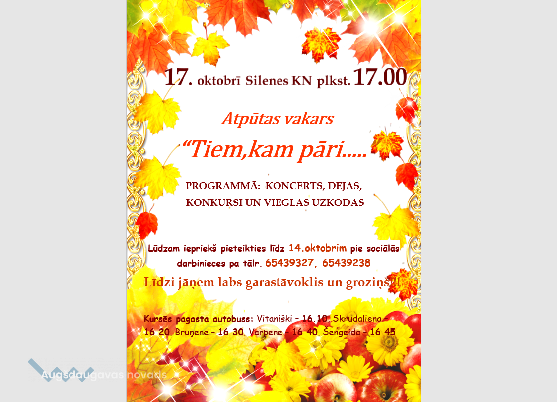 17. oktobrī plkst. 17.00 Silenes kultūras namā notiks atpūtas vakars "Tiem, kam pāri…". Obligāta iepriekšēja pieteikšanās.