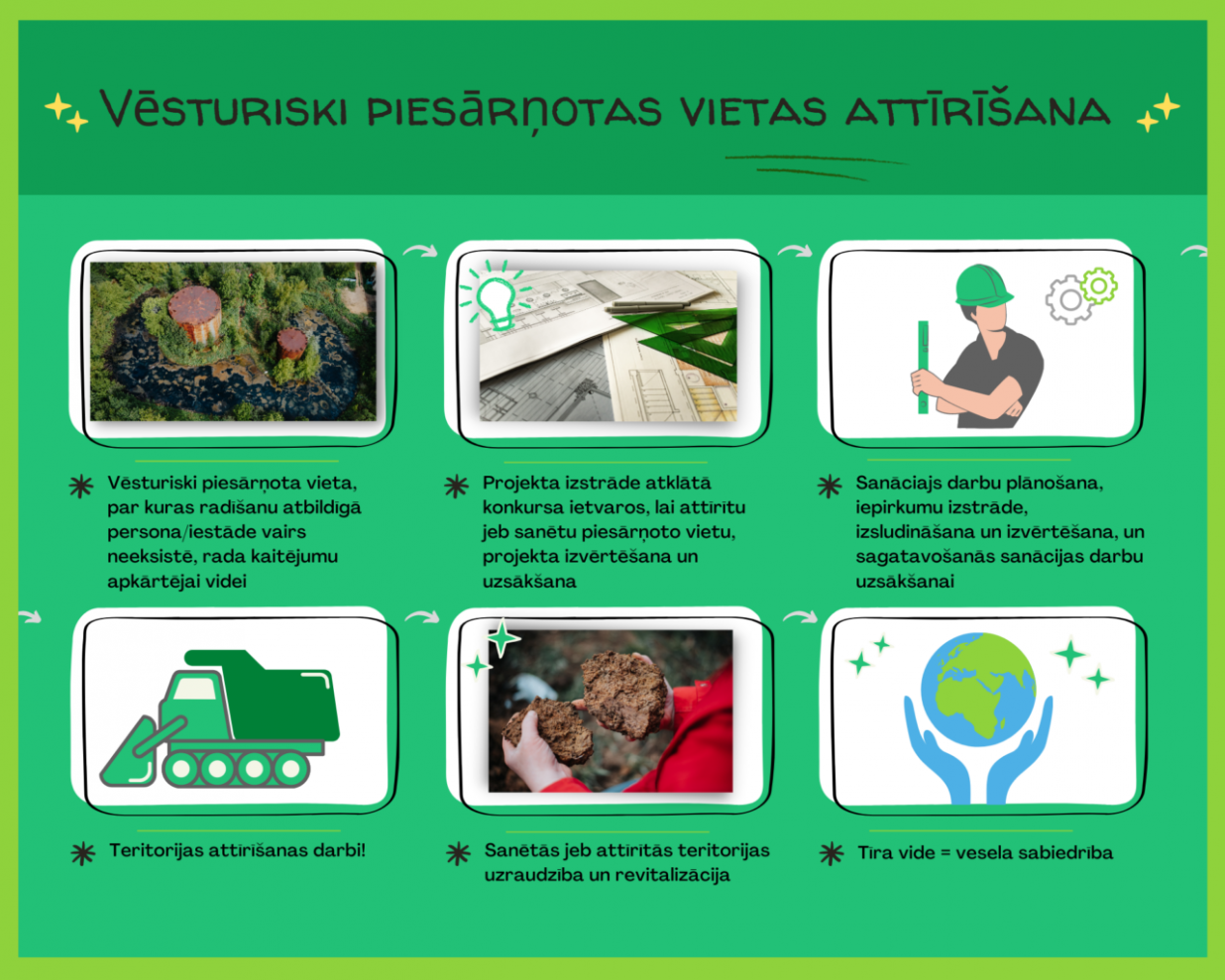 Tas nav nekāds noslēpums, ka Latvijas dabā ir atrodams dažāda veida vides piesārņojums, kas kopumā veido vairāk nekā 3500 piesārņotas un potenciāli piesārņotas vietas. Daļa no tām atrodas tālāk un citas tuvāk apdzīvotām vietām. Katras piesārņotās vietas rašanās stāsts un piesārņojuma apjoms ir atšķirīgs no citiem, tomēr rezultāts ir viens – piesārņota apkārtējā vide un apdraudēta apkārtējo iedzīvotāju veselība. Un apdraudēti esam ne vien mēs, bet arī mūsu nākamās paaudzes.