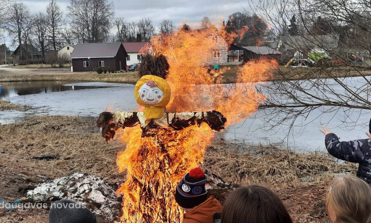 Beidzās svētki ar salmu lelles sadedzināšanu, kuras tērpa kabatās katrs varēja ielikt zīmīti ar to, ko viņš gribētu atstāt pagātnē. Dedzinot lelli, mūsu senči it kā uzveica nāvi ziemas veidolā, pavasarī radās jauna dzīvība.