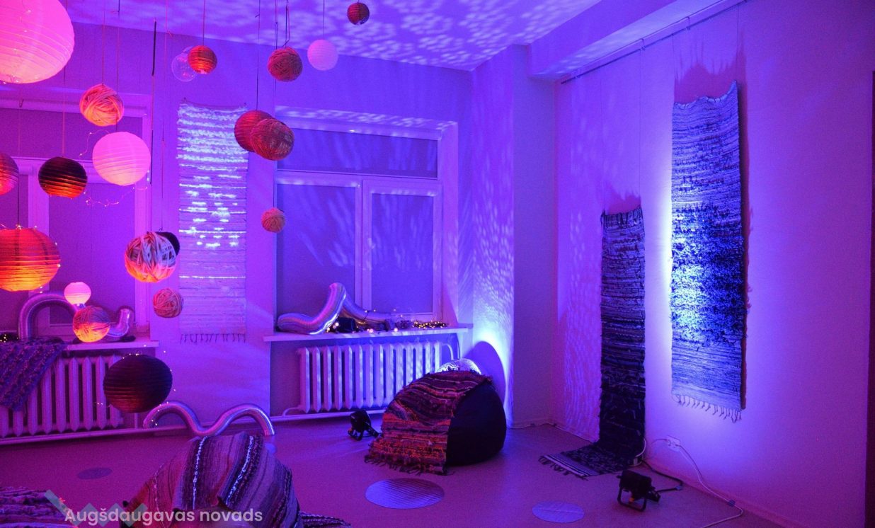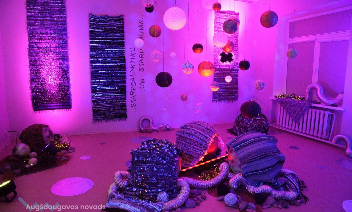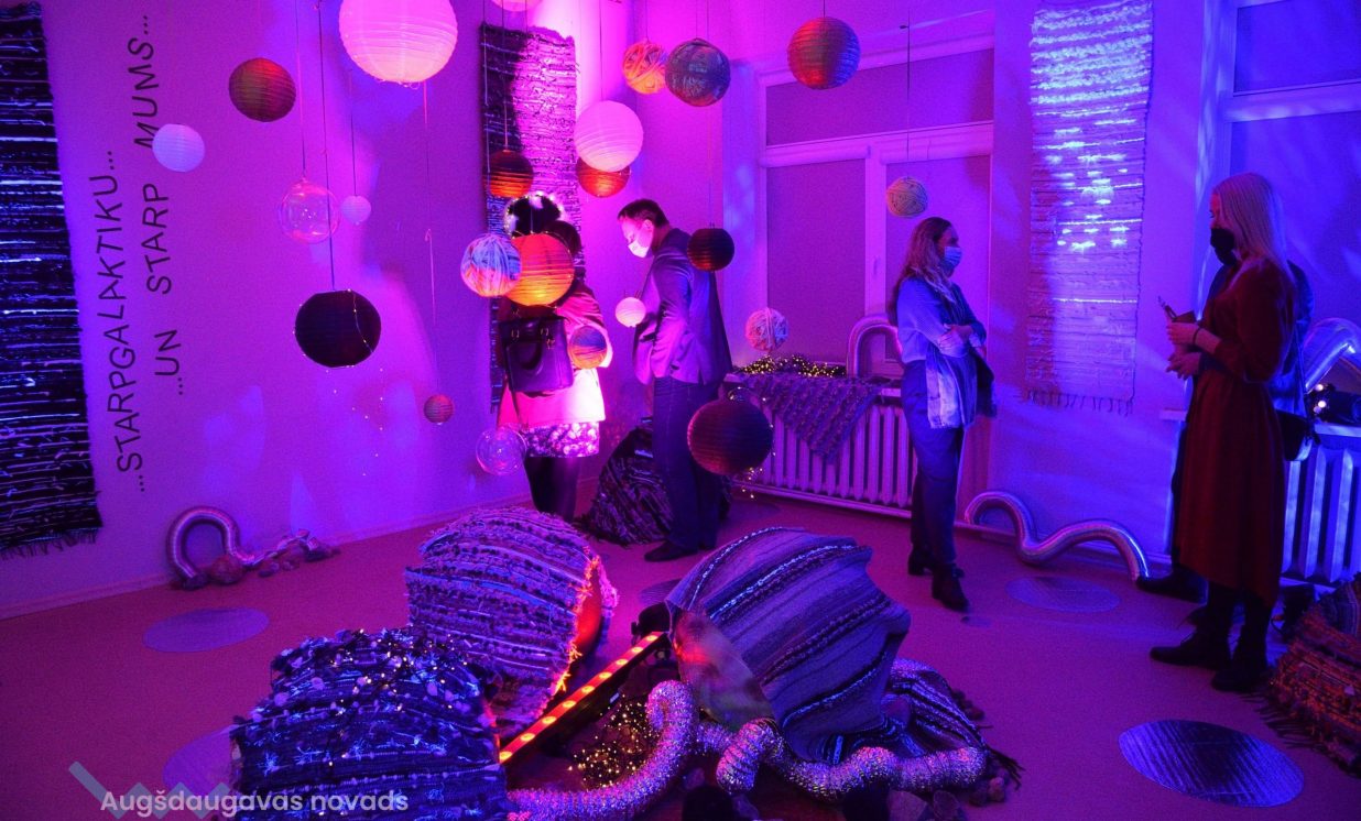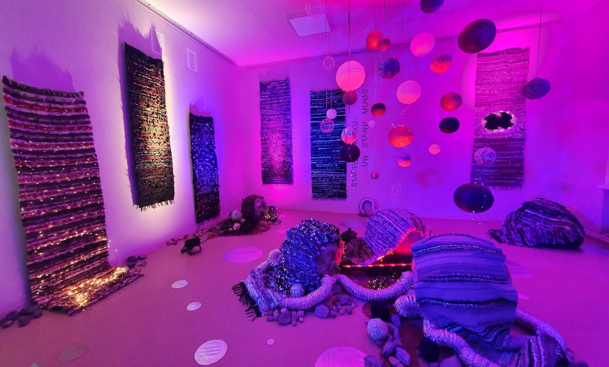 “Kosmosā nav ne ziemas un rudens, ne vasaras un ne pavasara, nav ne rīta, ne vakara, tāpēc esam radījušas īpašu telpu, kur aicinām ikvienu pabūt, meditēt, sajusties bezsvara stāvoklī un paklausīties mūziku,” teic Olga. Izstādes galvenie eksponāti ir Olgas un Intas austie darbi, kuros no dažādu krāsu materiāliem ieausti vien pašām autorēm zināmi noslēpumaini raksti – vēstis no kosmosa. Fona skan pieklusināta kosmiska mūzika un fragmenti no Antuāna de Sent-Ekziperī grāmatas “Mazais Princis”, kas rada īpašu atmosfēru un vēlmi ieslīgt gaisīgajā pufā un nedaudz aizmirsties.