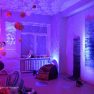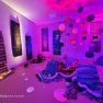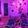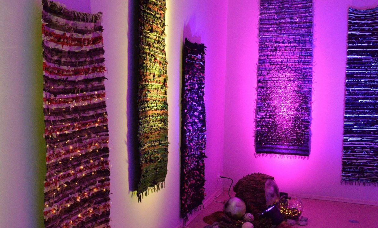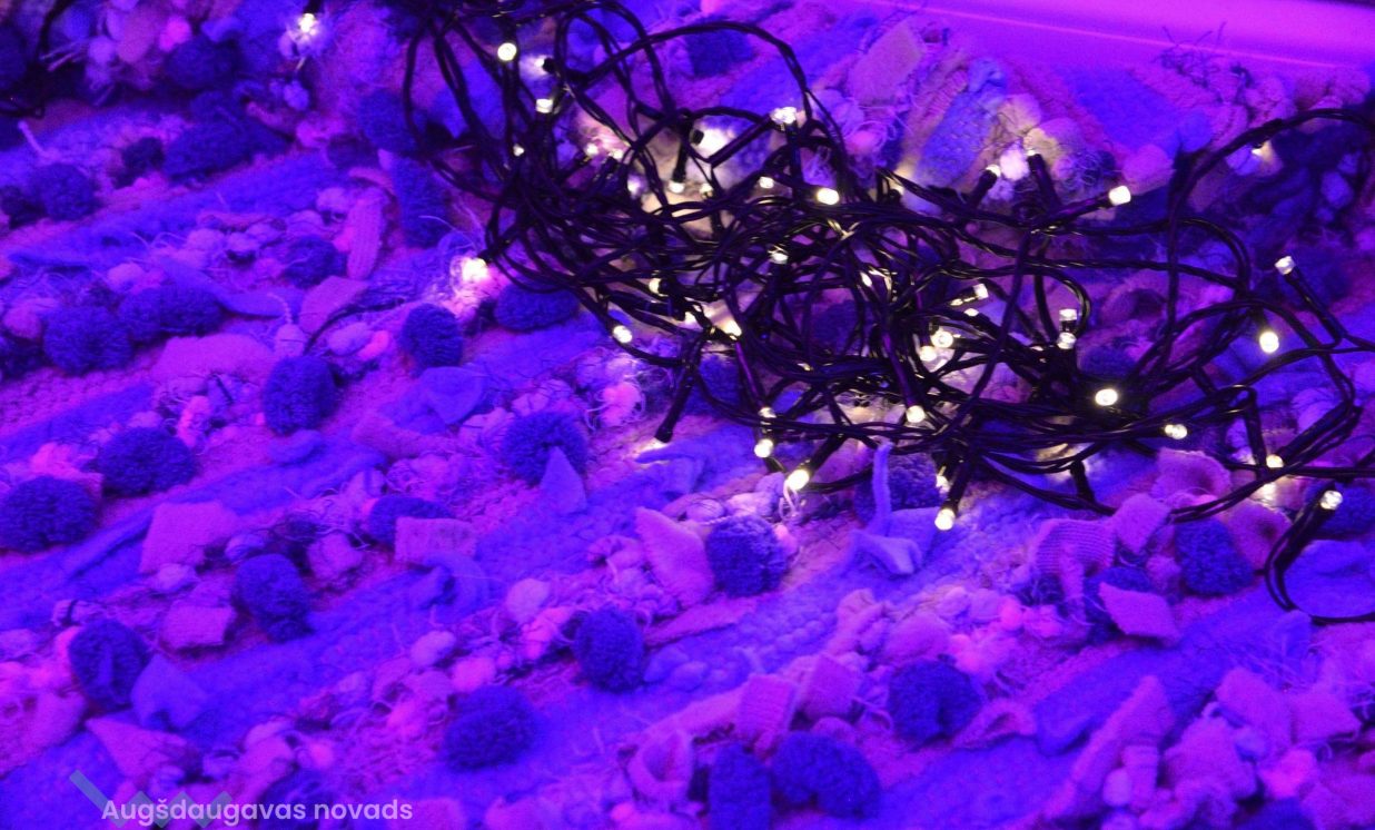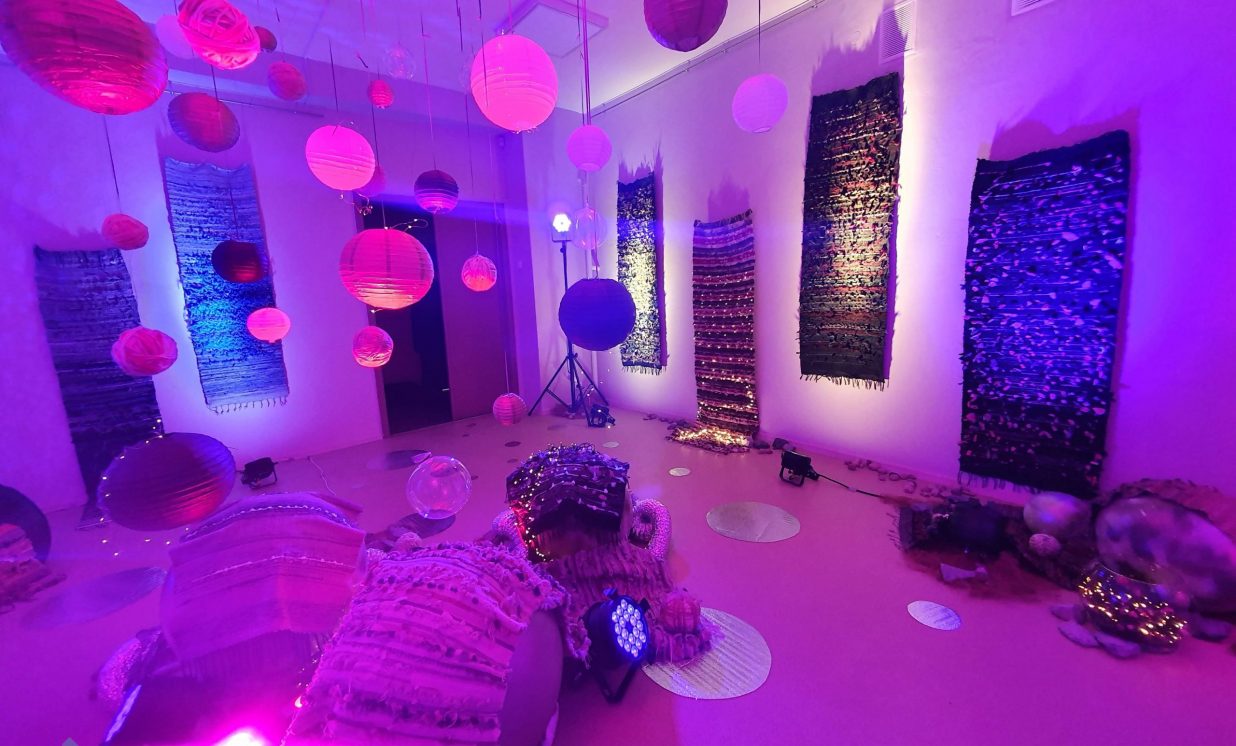 “Kosmosā nav ne ziemas un rudens, ne vasaras un ne pavasara, nav ne rīta, ne vakara, tāpēc esam radījušas īpašu telpu, kur aicinām ikvienu pabūt, meditēt, sajusties bezsvara stāvoklī un paklausīties mūziku,” teic Olga. Izstādes galvenie eksponāti ir Olgas un Intas austie darbi, kuros no dažādu krāsu materiāliem ieausti vien pašām autorēm zināmi noslēpumaini raksti – vēstis no kosmosa. Fona skan pieklusināta kosmiska mūzika un fragmenti no Antuāna de Sent-Ekziperī grāmatas “Mazais Princis”, kas rada īpašu atmosfēru un vēlmi ieslīgt gaisīgajā pufā un nedaudz aizmirsties.